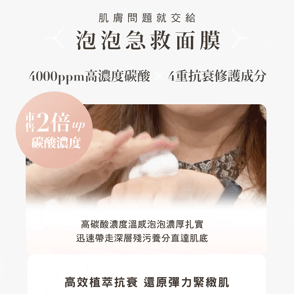 蘋果抗老因子結合獨家S.M.E機制修護再現滑嫩肌膚。 ‧蜂王乳等三重修護活化成分,讓肌膚去黃提亮、細緻平滑。 ‧甘草等三重舒緩成分,穩定安撫,修護健康亮澤肌。 ‧4,000ppm高密度碳酸,讓肌膚體驗深呼吸 ‧SPA級賦活急救,一邊清潔代謝,一邊活化新生 ◆ 商品用途: 清潔保養肌膚 ◆ 使用方法 將產品搖晃後從瓶口取適量(約直徑5CM)於手掌心,均勻塗抹在肌膚。 讓泡沫停留5分鐘後,以指腹輕輕打圈溫柔按摩後用清水洗淨。 ◆ 建議膚質: 適合所有膚質。 ◆ 商品內附 : 無 ◆ 注意事項: 1. 使用時請留意肌膚是否有任何異常,若肌膚有任何不適請立即停止使用,建議先向皮膚科醫師諮詢。 2. 請避開傷口、紅腫、濕疹…等部位。 3.若不慎流入眼睛時,請立即用清水洗淨。 4. 使用完畢後請務必蓋緊瓶蓋。 5 .請儲放於幼童無法拿取的位置。 6. 請勿放置於高溫、低溫、日光直射的位置,請於常溫(約20度C~40度C)使用,低溫及高溫下使用易造成無法產生泡沫的情形。 7. 請均勻搖晃後再使用。若沒有均勻搖晃很難使用到最後。 8. 請將產品直立式使用。 ◆ 本品為易燃品、高壓氣體壓縮之容器,為避免危險,請遵守下列事項: 1.請勿在火源、火苗附近或吸菸時使用。 2.室內正在使用火源時,請勿大量使用本品。 3.使用時勿噴向火焰或熾熱物體上。 4.溫度過高時有破裂的危險,故請勿將本品置於陽光直射處,或火爐、電爐等溫度可高達40度以上之場所。 5.請勿將本品投入火中。 6.使用完畢後不可破壞或燃燒瓶身。 7.丟棄時,請在無火源且空曠戶外處,按壓噴頭至氣體洩盡且噴射聲音消失為止。