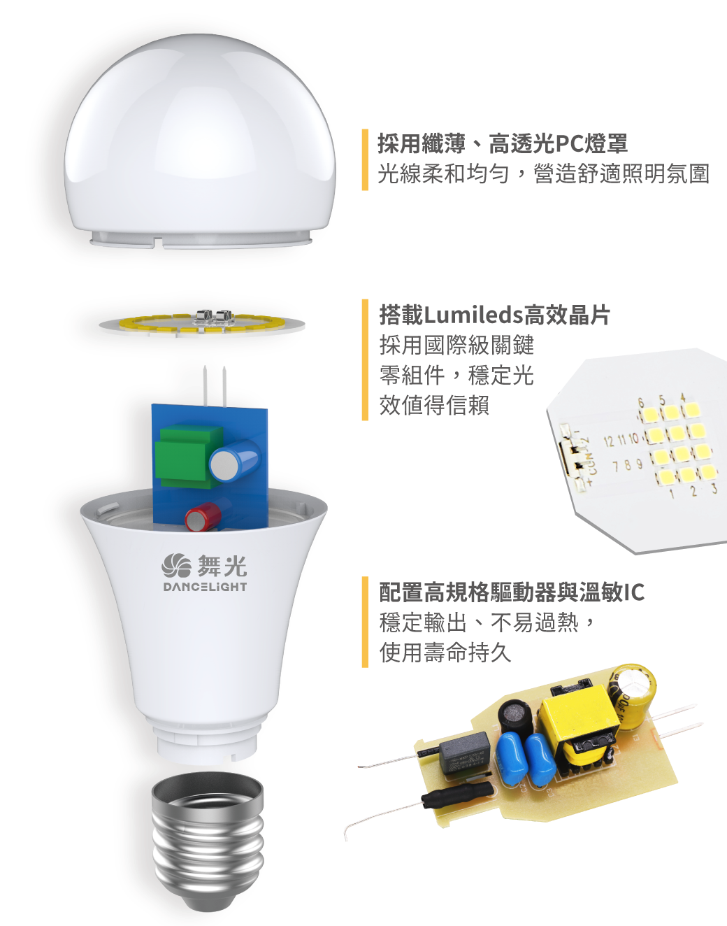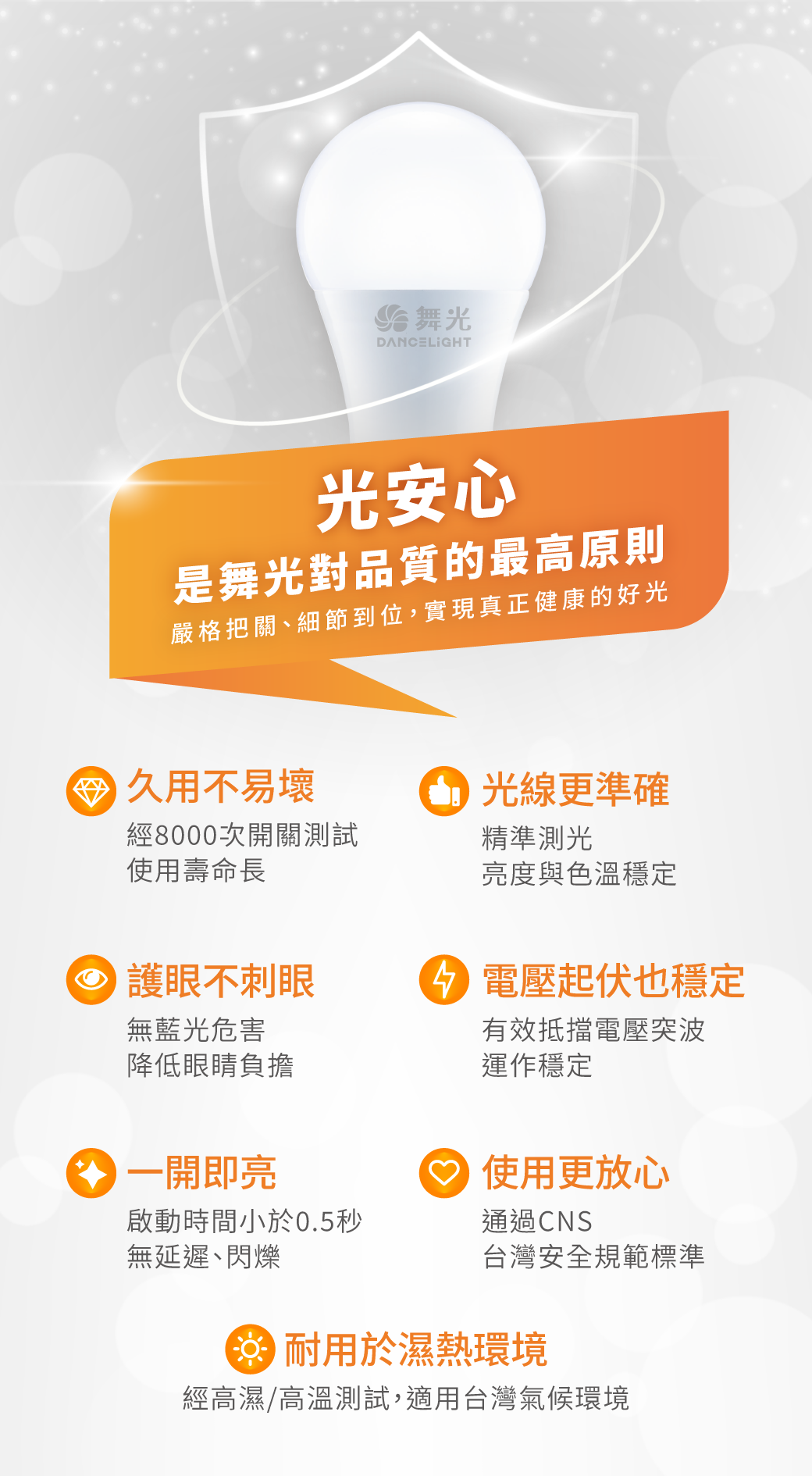 1. 通過台灣CNS 品質有保障 2. 通過無藍光危害認證 3. 通過EMI 測試 4. 超高光通量,照度大於20W 螺旋,省電約50% 5. 大廣角330° 發光角度,可產生最大光強照度 6. 長壽命15000 小時,一顆LED 球泡可抵3 顆以上省電燈泡 7. 高演色性Ra ≧ 80,讓被照物色彩更真實