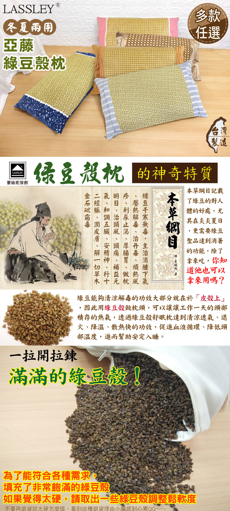 【LASSLEY 蕾絲妮】亞藤綠豆殼枕-冬夏兩用(綠豆枕 豆殼枕 涼枕 涼感 天然 透氣 枕頭 草蓆枕 四季枕 台灣製造)