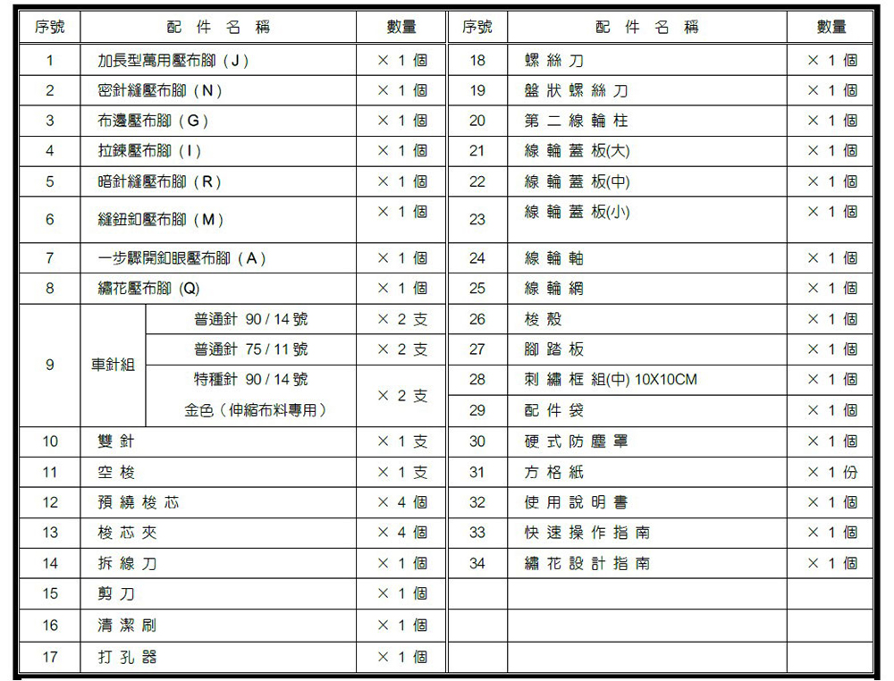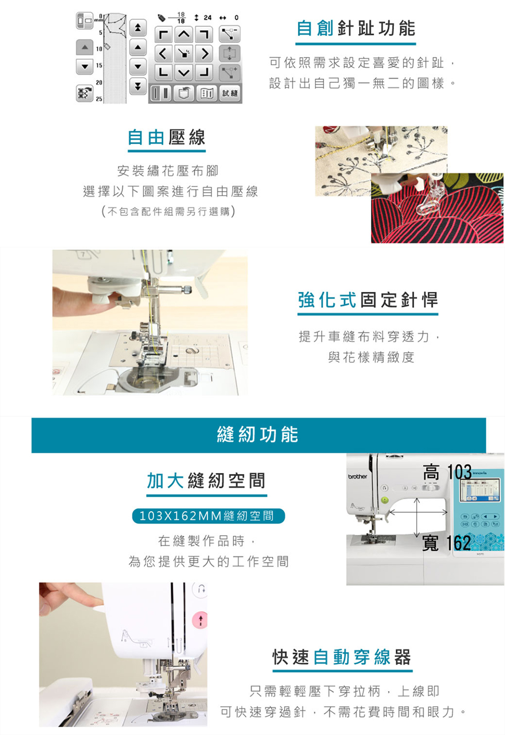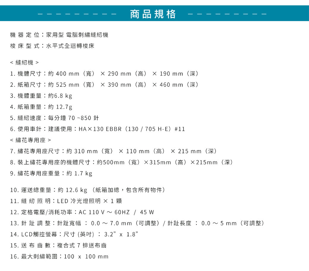 機器定位:家用型電腦刺繡縫紉機 梭床型式:水平式全迴轉梭床 (縫紉機) 1. 機體尺寸:約 400 mm(寬) × 290 mm(高) × 190 mm(深) 2. 紙箱尺寸:約 525 mm(寬) × 390 mm(高) × 460 mm(深) 3. 機體重量:約6.8 kg 4. 紙箱重量:約 12.7g 5. 縫紉速度:每分鐘 70 ~850 針 6. 使用車針:建議使用:HA×130 EBBR(130 / 705 H-E)#11 (繡花專用座) 7. 繡花專用座尺寸:約 310 mm(寬) × 110 mm(高) × 215 mm(深) 8. 裝上繡花專用座的機體尺寸:約500mm(寬)×315mm(高)×215mm(深) 9. 繡花專用座重量:約 1.7 kg 10. 運送總重量:約 12.6 kg (紙箱加總,包含所有物件) 11. 縫 紉 照 明:LED 冷光燈照明 × 1 顆 12. 定格電壓/消耗功率:AC 110 V 〜 60HZ / 45 W 13. 針 趾 調 整:針趾寬幅 : 0.0 〜 7.0 mm(可調整)/ 針趾長度 : 0.0 〜 5 mm(可調整) 14. LCD觸控螢幕:尺寸 (英吋) : 3.2”x 1.8” 15. 送 布 齒 數:複合式 7 排送布齒 16. 最大刺繡範圍:100 x 100 mm 無須商檢 NCC字號:CCAI14LP1060T1