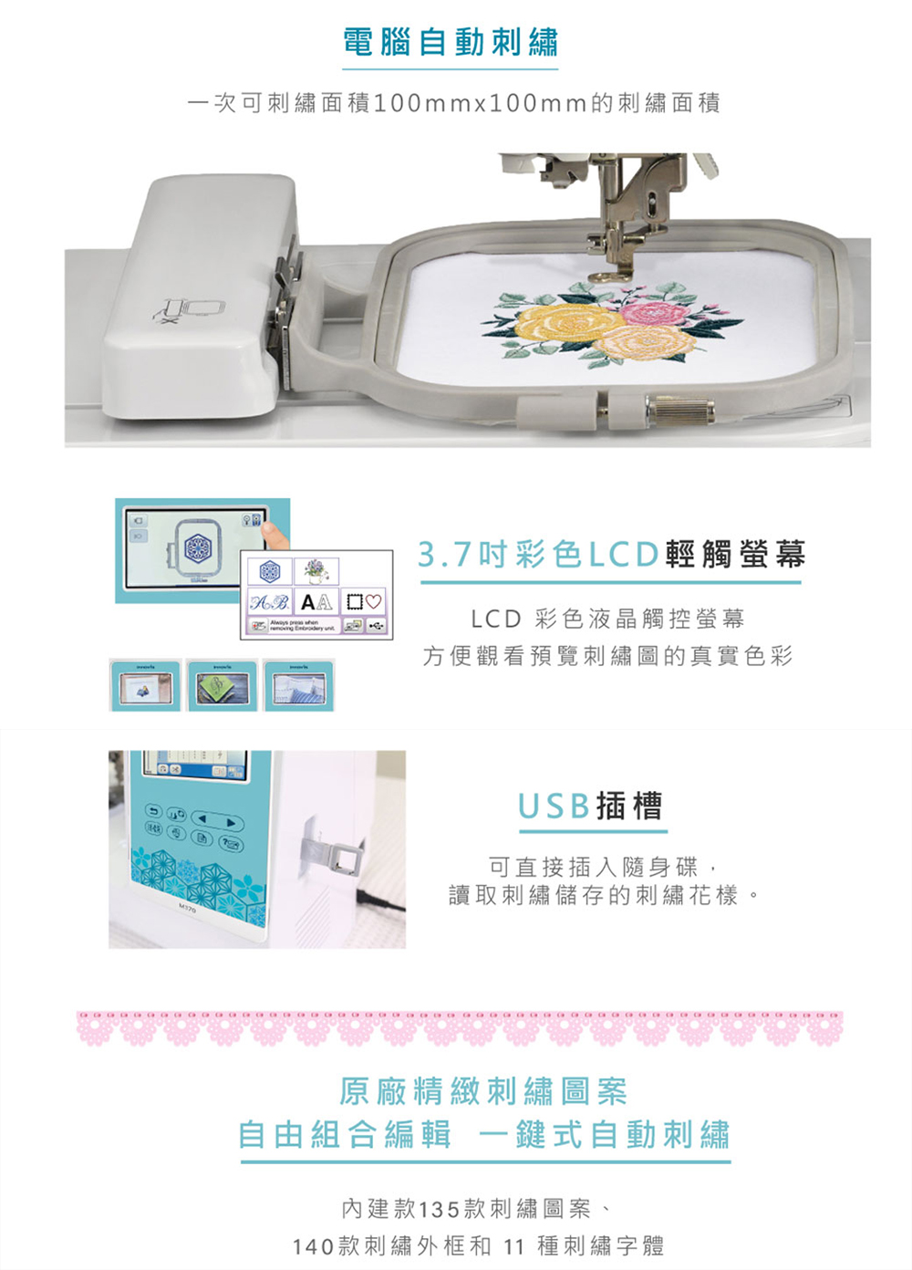 Brother】無線奇機智慧型電腦刺繡縫紉機 M-370 支援WIFI/中文繁體字都能繡/自動切線 (※4月底前送刺繡禮包+101種刺繡圖檔USB)