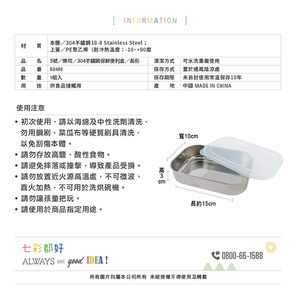 .304不鏽鋼材質,耐用易清洗。 .密封不透氣,保鮮不串味。 .有效防漏,增強密封性。 .可用於烤箱、電鍋、洗烘碗機。 .上班外食、野餐露營、烹調備料均可適用。
