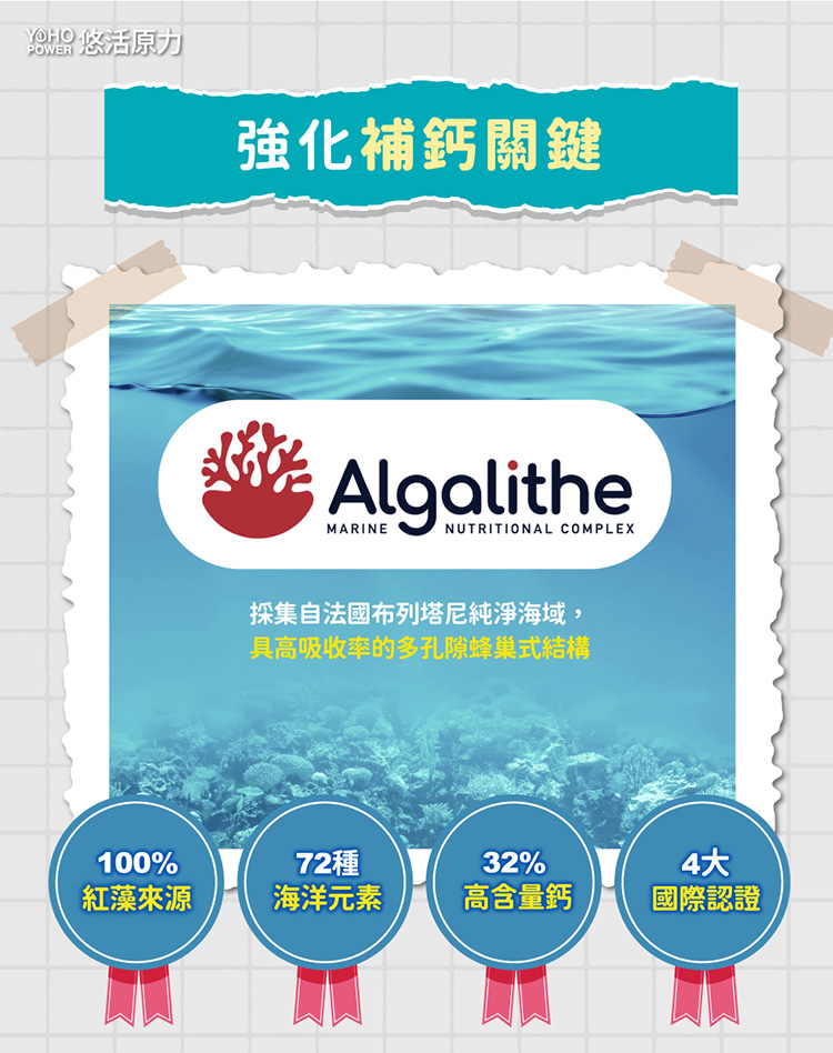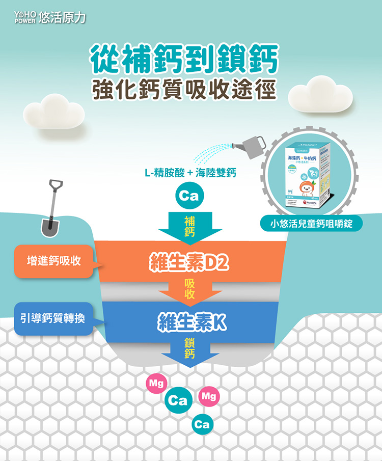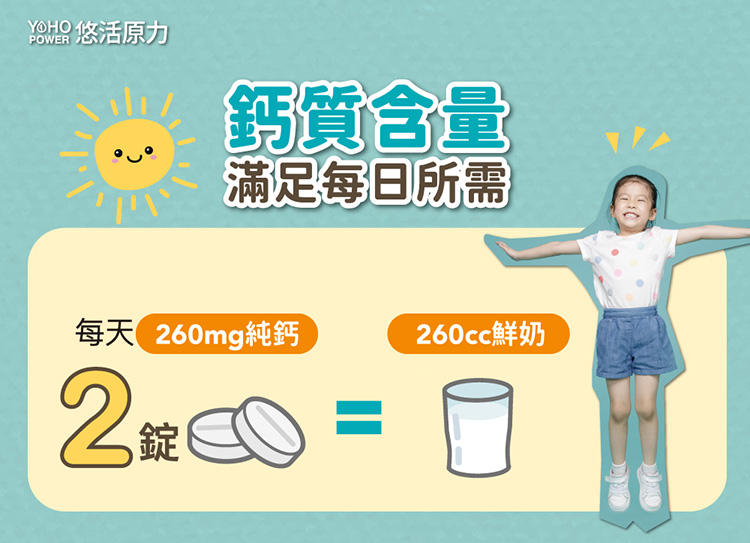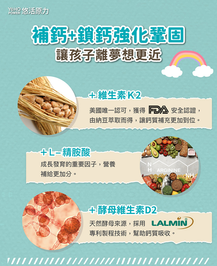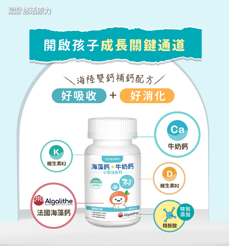 成分:牛奶鈣、法國紅藻粉(鈣含量32%)、異麥芽酮糖醇(巴糖醇)(甜味劑)、甘露醇(D-甘露醇(甜味劑)、聚乙烯吡咯烷酮)、優酪粉(蔗糖、脫脂奶粉、麥芽糊精、全脂奶粉、葡萄糖、檸檬酸、酵母精粉、香料、脂肪酸甘油酯)、乳糖、麥芽糊精、二氧化矽、聚乙烯吡咯烷酮、無水檸檬酸、啤酒酵母粉(含維生素D)、硬脂酸鎂、硬脂酸、L-精胺酸、優格香料(二氧化矽、香料、醋酸、焦糖色素、食用精油(柑橘、檸檬))、納豆菌醱酵粉(麥芽糊精、納豆菌醱酵物(含維生素K2))、蔗糖素(甜味劑)