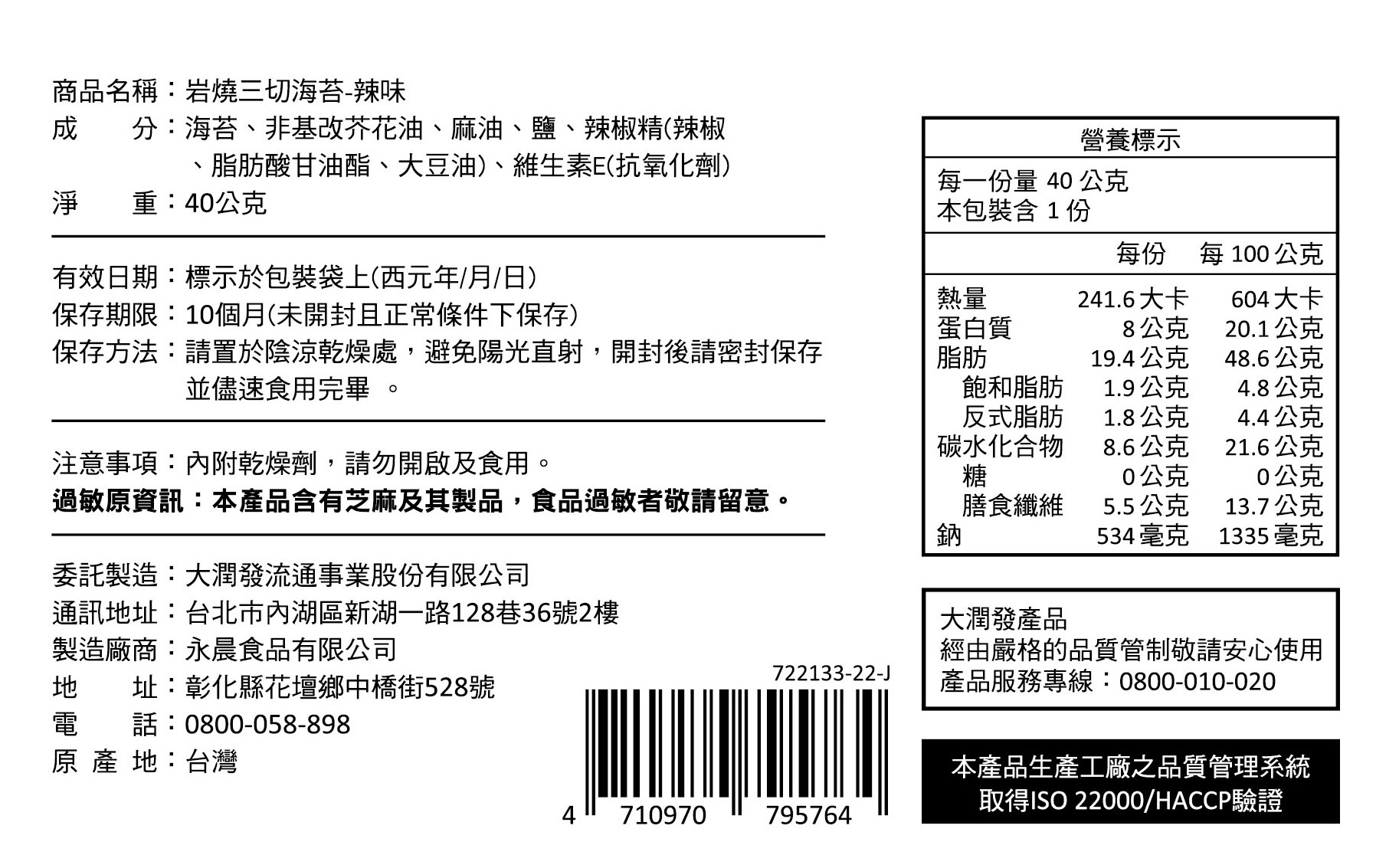 成分:海苔、非基改芥花油、麻油、鹽、辣椒精(辣椒、脂肪酸甘油酯、大豆油)、維生素E(抗氧化劑)