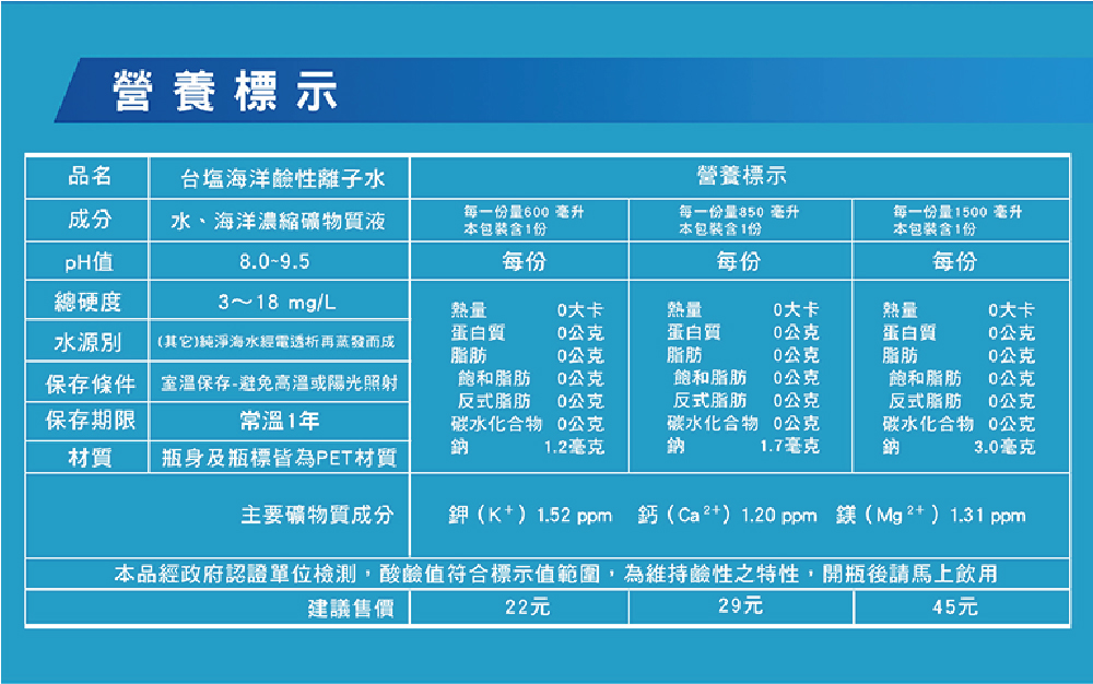 | 其他詳細說明 | 1.取自台灣海峽洋流,離岸1560米,並低於海平面12米深之潔淨海水 2.經高溫蒸發、UV殺菌,熟水衛生安全更健康 3.三效特殊專利製程。(中華民國發明專利第I308061)水分子團小,入口回甘,純淨又好喝 4.採用鑽石瓶型設計,品味時尚,引領風潮 |
