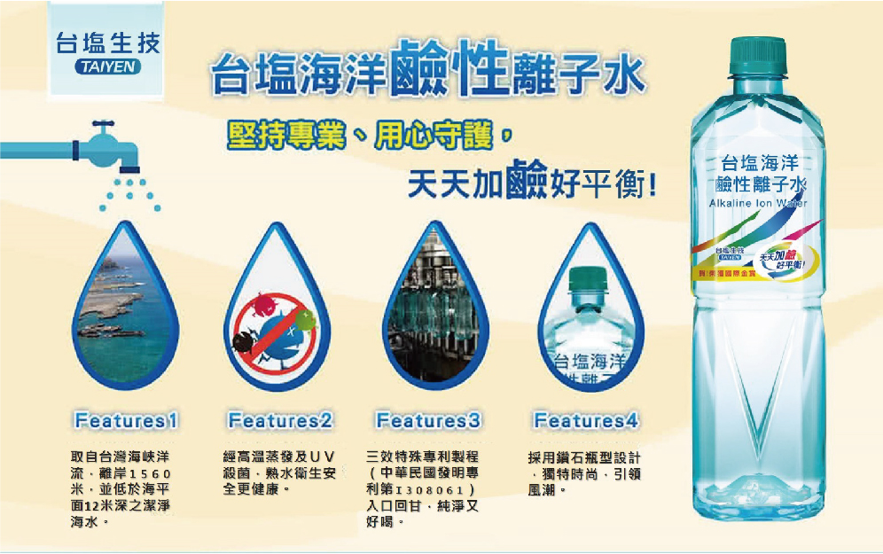 | 商品說明 | 1.取自台灣海峽洋流,離岸1560米,並低於海平面12米深之潔淨海水 2.經高溫蒸發、UV殺菌,熟水衛生安全更健康 3.三效特殊專利製程。(中華民國發明專利第I308061)水分子團小,入口回甘,純淨又好喝 4.採用鑽石瓶型設計,品味時尚,引領風潮 |