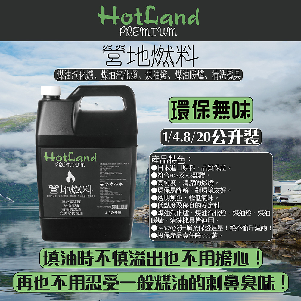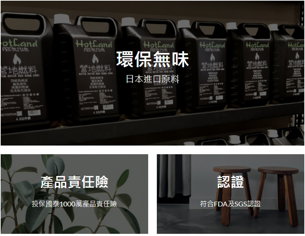 HotLand頂級高純度營地燃料,投保產品責任險1000萬,請消費者安心購買。