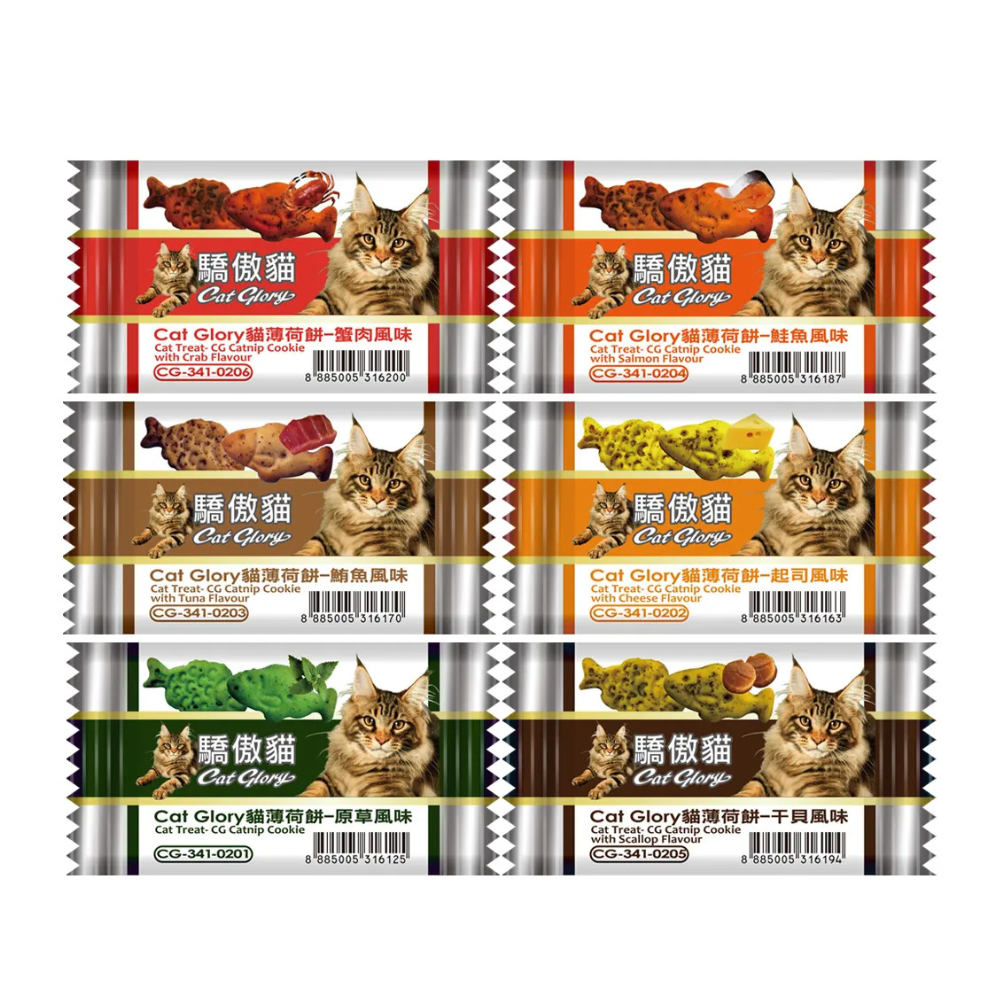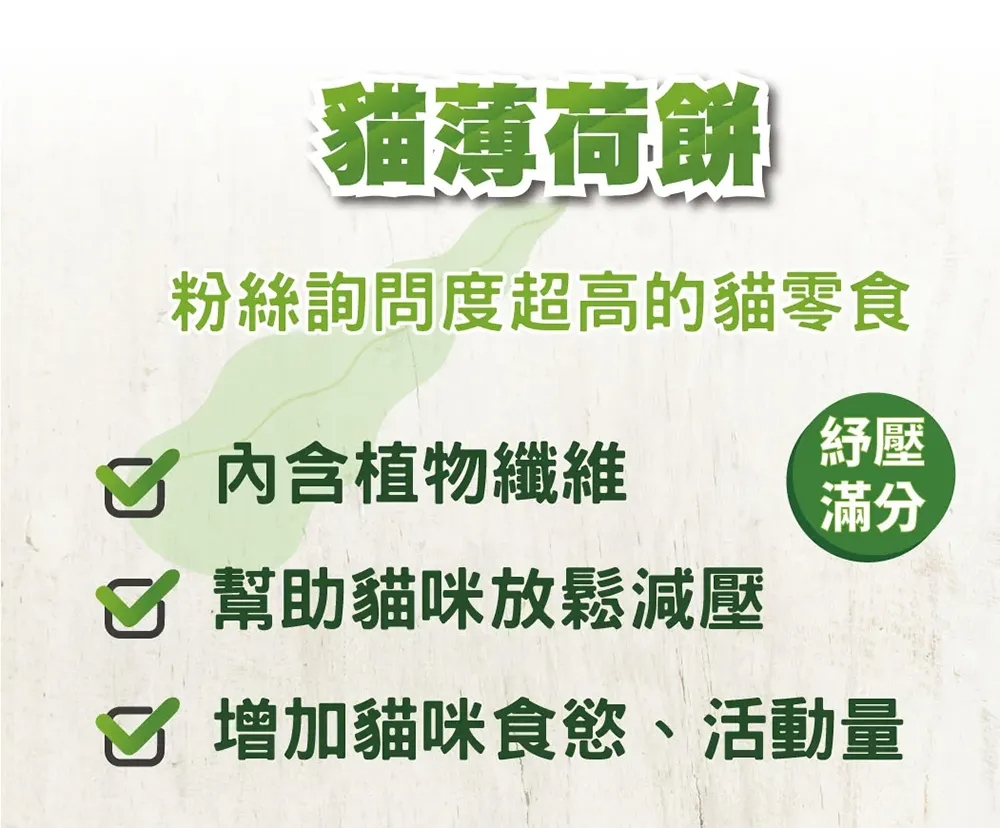 成分:麵粉,麥芽糖,棕油,魚粉,貓薄荷,啤酒酵母,葵花仔油,葡萄糖,大豆卵磷脂,天然維生素E,食用色素綠色3號。