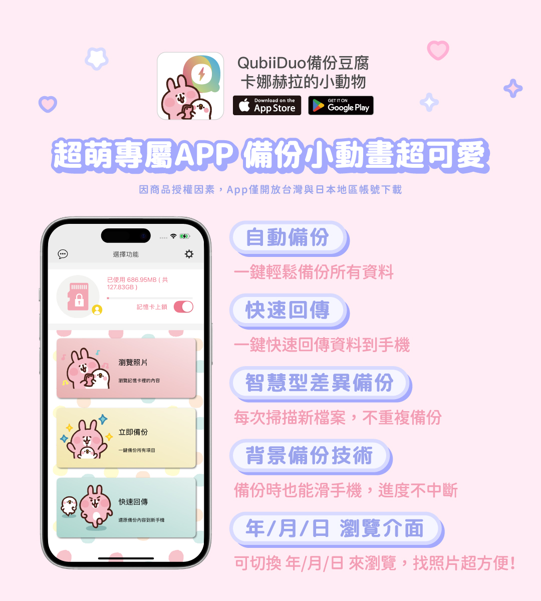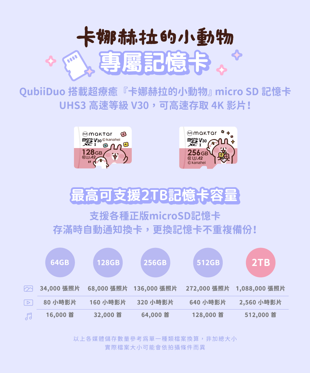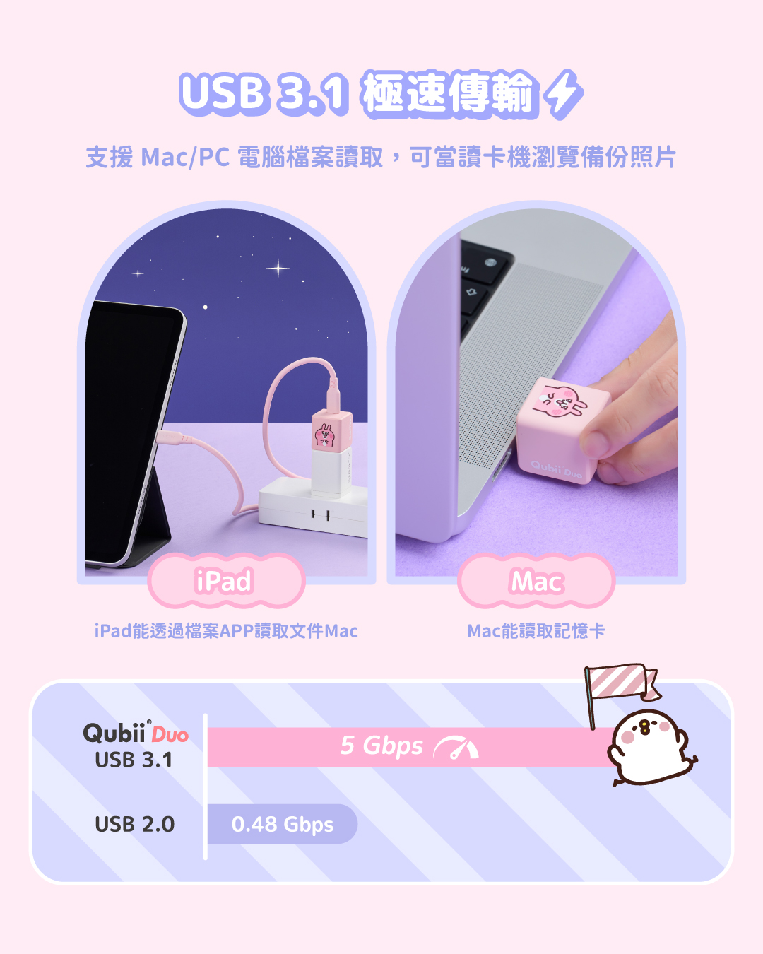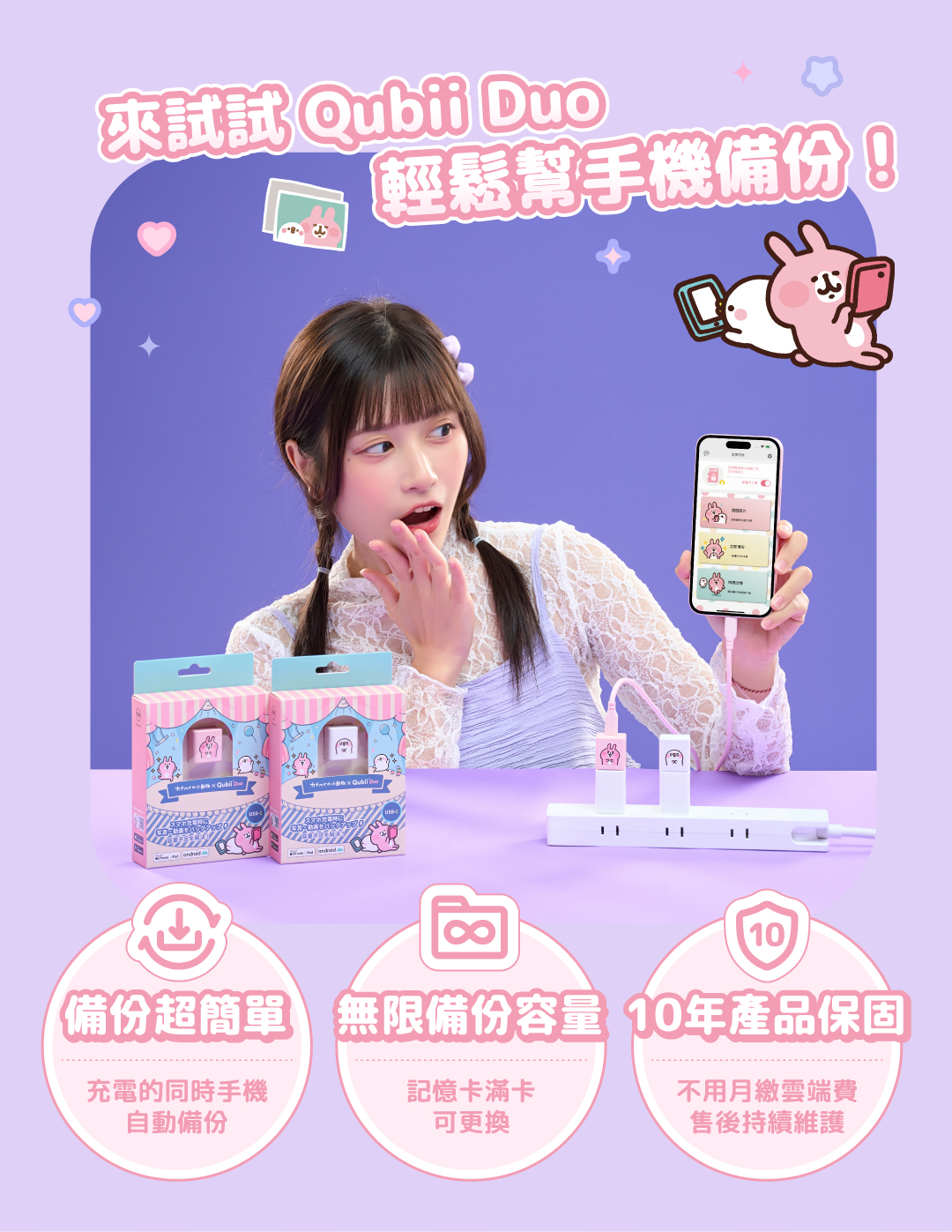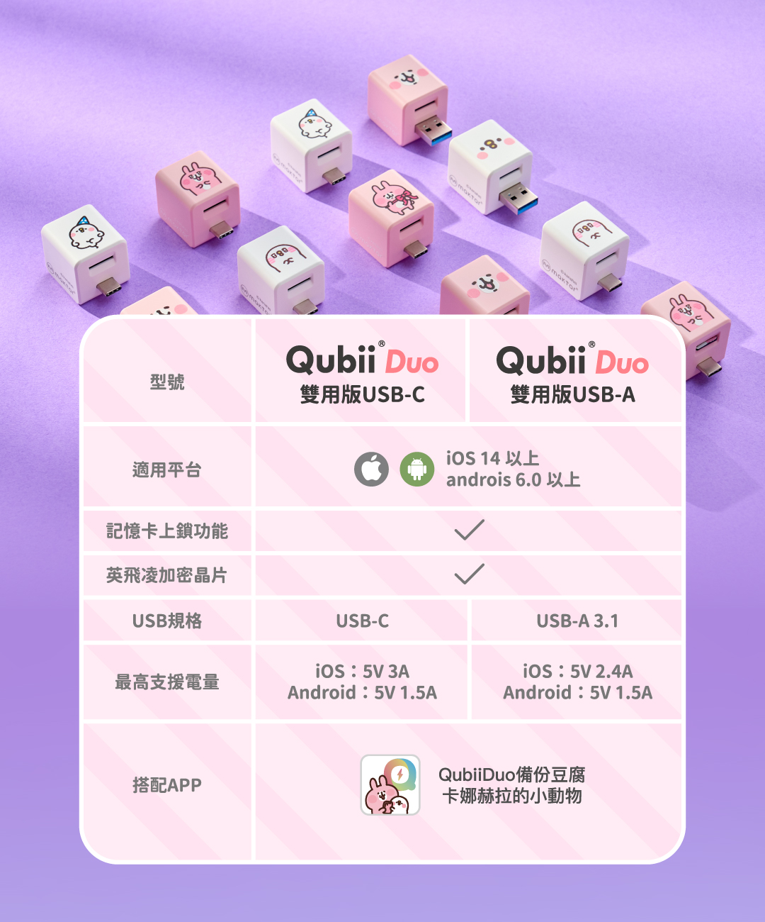 ● 品名:QubiiDuo USB-C 備份豆腐 卡娜赫拉的小動物 ● 顏色:亮眼兔兔(粉) / 閃爍P助(白) ● 尺寸:4x2.5x2.5 cm ● 重量:20g ● 容量:不含記憶卡,可支援 64G / 128G / 256G / 512G / 1TB / 2TB 記憶卡 ● 介面:USB-C ● 手機系統:iOS 14 / Android 6.0以上 ● 電腦系統:Mac/ PC電腦 Windows 7以上,不支援Win XP ● 製造地:台灣設計製造 ● 產品保固:2年,註冊產品可延長保固至10年 ● 本產品不含記憶卡