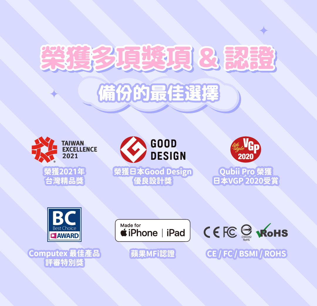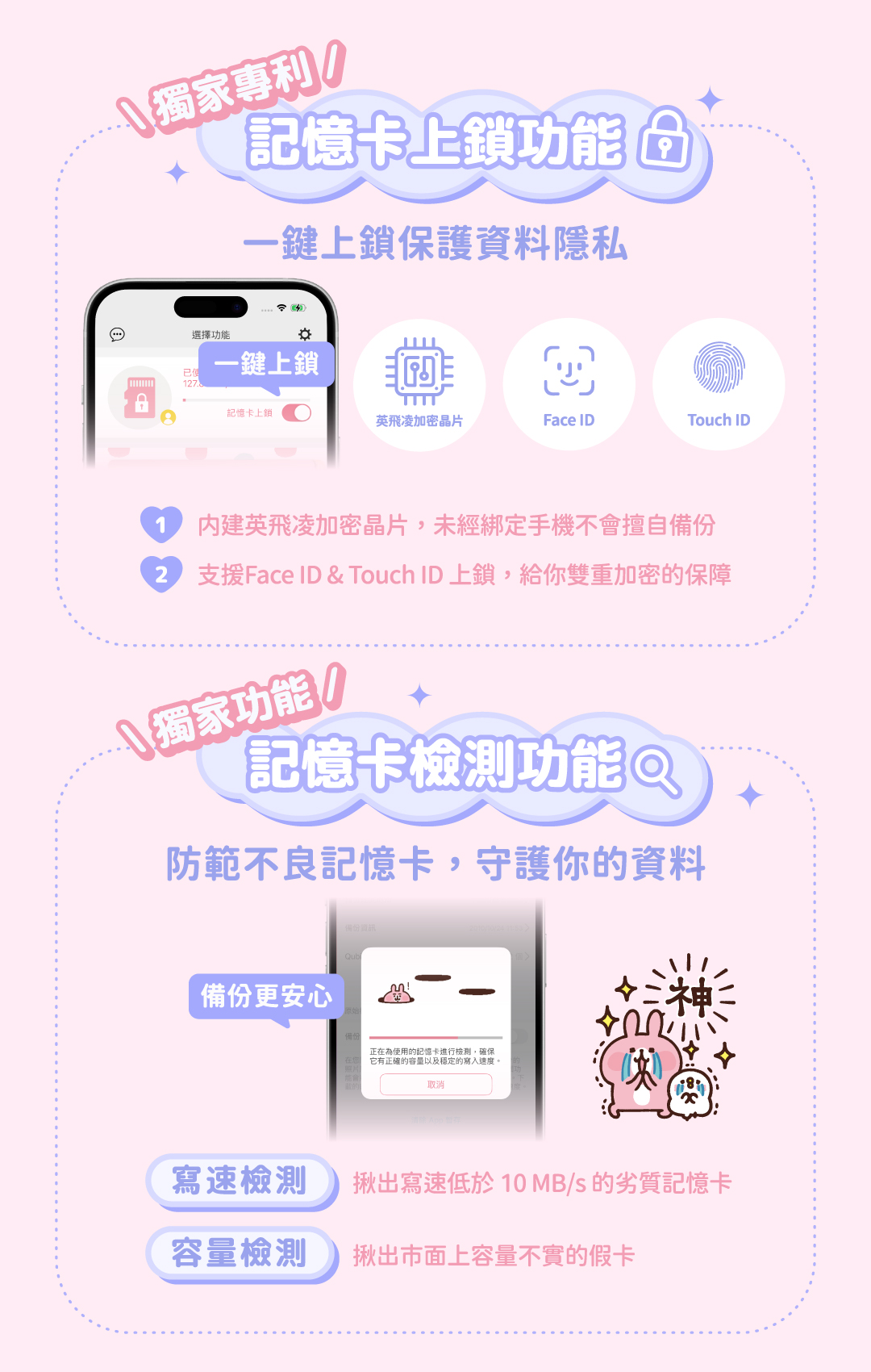 • 備份 + 充電 + 無限擴充容量 • 蘋果、安卓手機都適用 • 支援最新款 iPhone16 • MFi 蘋果認證 • 支援 45W PD快充 • 可更換記憶卡,無限擴充儲存容量 • 可當讀卡機,電腦隨插即用 • 支援 iOS & Android 雙系統 • 可備份照片、影片、聯絡資訊 • 充電同時自動備份,自動記憶備份進度 • 智慧型差異備份,不重覆備份 • 背景備份技術,備份時也能滑手機 • APP一鍵鎖上記憶卡,保護隱私簡單方便! • 蘋果MFi認證,品質有保障 • 產品保固2年,註冊產品可延長保固至10年