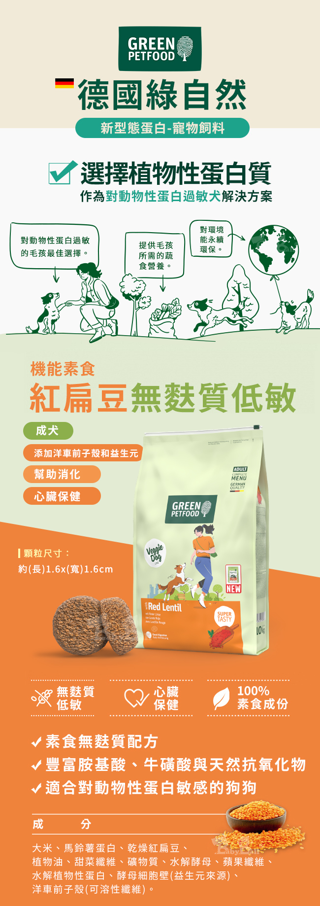 Green Petfood 德國綠自然】機能素食 紅扁豆 無麩質低敏成犬飼料 10KG(狗飼料 乾糧 綠色食品)