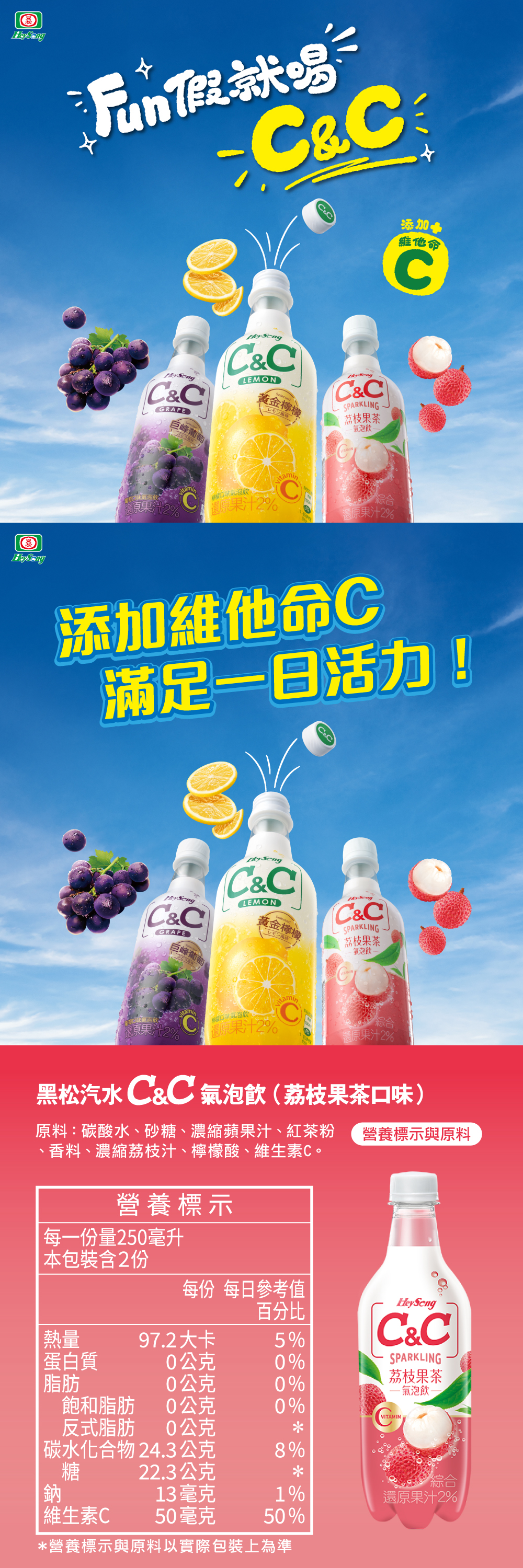 | 產品特色 | 1.荔枝果汁搭配紅茶基底,與清爽氣泡碰撞出清新風味 (果汁含量2%) 2.添加維他命C,滿足一日所需 3.具備清真認證 |