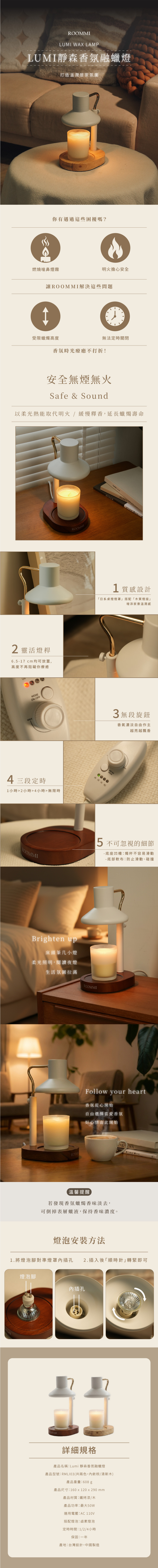 產品名稱:Lumi 靜森香氛融蠟燈 產品型號:RMLI03(共兩色,內斂棕/清新木) 產品重量:608 g 產品尺寸:160 x 120 x 290 mm 產品材質:鐵烤漆/木 產品功率:最大50W 適用電壓:AC 110V 搭配燈泡:鹵素燈泡 定時時間:1/2/4小時