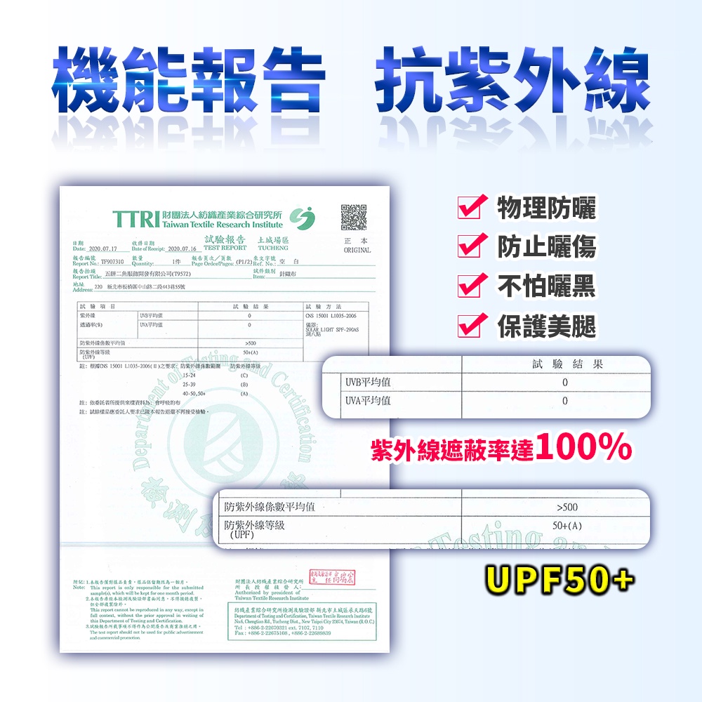 坊間有許多抗UV布料是採用助劑來阻隔紫外線,經由多次水洗後布料的抗UV功能就失去作用,而複合科技纖維(UPF 50+),抗紫外線是永久機能,不僅可以有效抗UV更可防止肌膚因日曬造成皮膚病變。