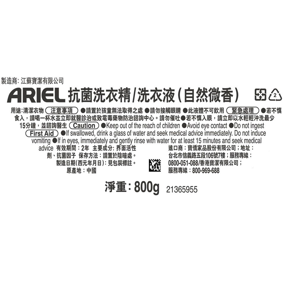 品名 / ARIEL抗菌洗衣精/洗衣液-自然微香 規格 / 800g 成分&材質 / 詳見產品包裝標示 產地 / 中國 保存期限 / 詳見產品包裝標示 保存方法 / 請放置於乾燥陰涼處,避免太陽直射常溫保存,開封後請冷藏並儘快食用完畢 注意事項 / 詳見產品包裝標示 製造廠商或國內負責廠商名稱 / 寶僑家品股份有限公司 製造廠商或國內負責廠商地址 / 台北市信義路五段106號7樓 製造廠商或國內負責廠商電話 / 0800051088 ◎ 製造日期與有效期限,成分皆標示於包裝盒上 ◎ 本產品網頁因拍攝關係,圖檔略有差異,實際以廠商出貨為主 ◎ 本產品文案若有變動敬請參照實際商品為準 ◎ 以消費者收受日算起,至少距有效日期前【30】日以上:依商品包裝標示,若收到小於30天可聯絡客服供退換貨