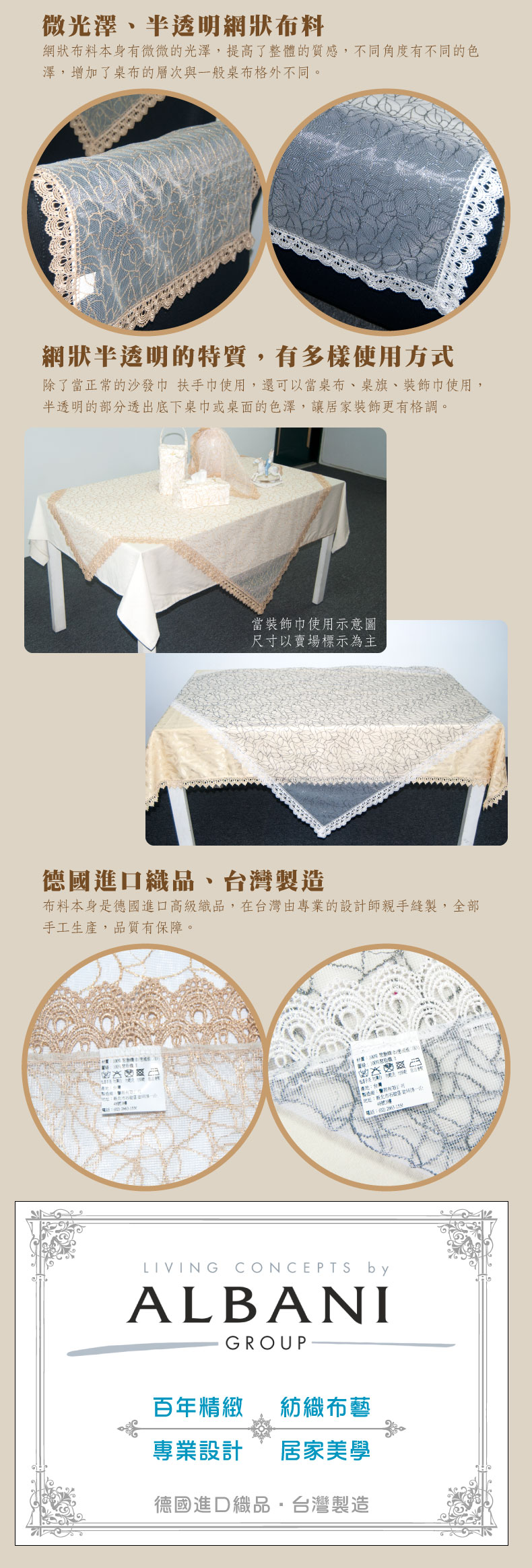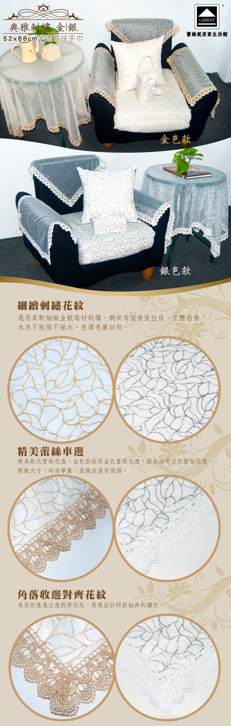 【LASSLEY 蕾絲妮】典雅刺繡-52X68CM扶手巾(薄紗 沙發 裝飾巾 鏤空 蕾絲 花邊 金 銀 半透明 ALBANI 德國進口 台灣製造)
