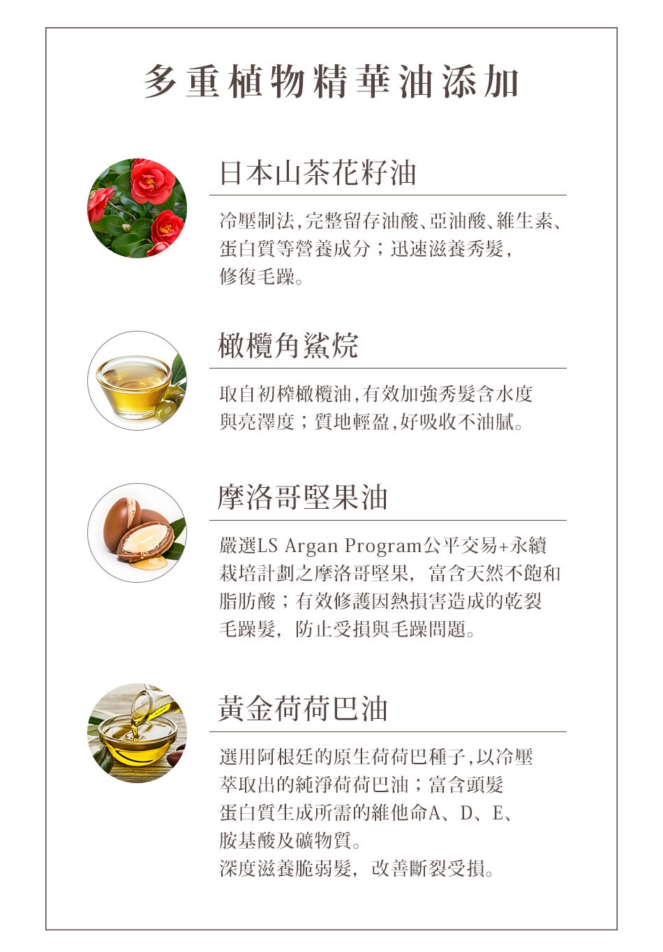 👍 多重植物油添加:日本山茶花籽油 x 橄欖角鯊烷 x 黃金荷荷巴油,加強秀髮含水度與亮澤度;質地輕盈,好吸收不油膩。