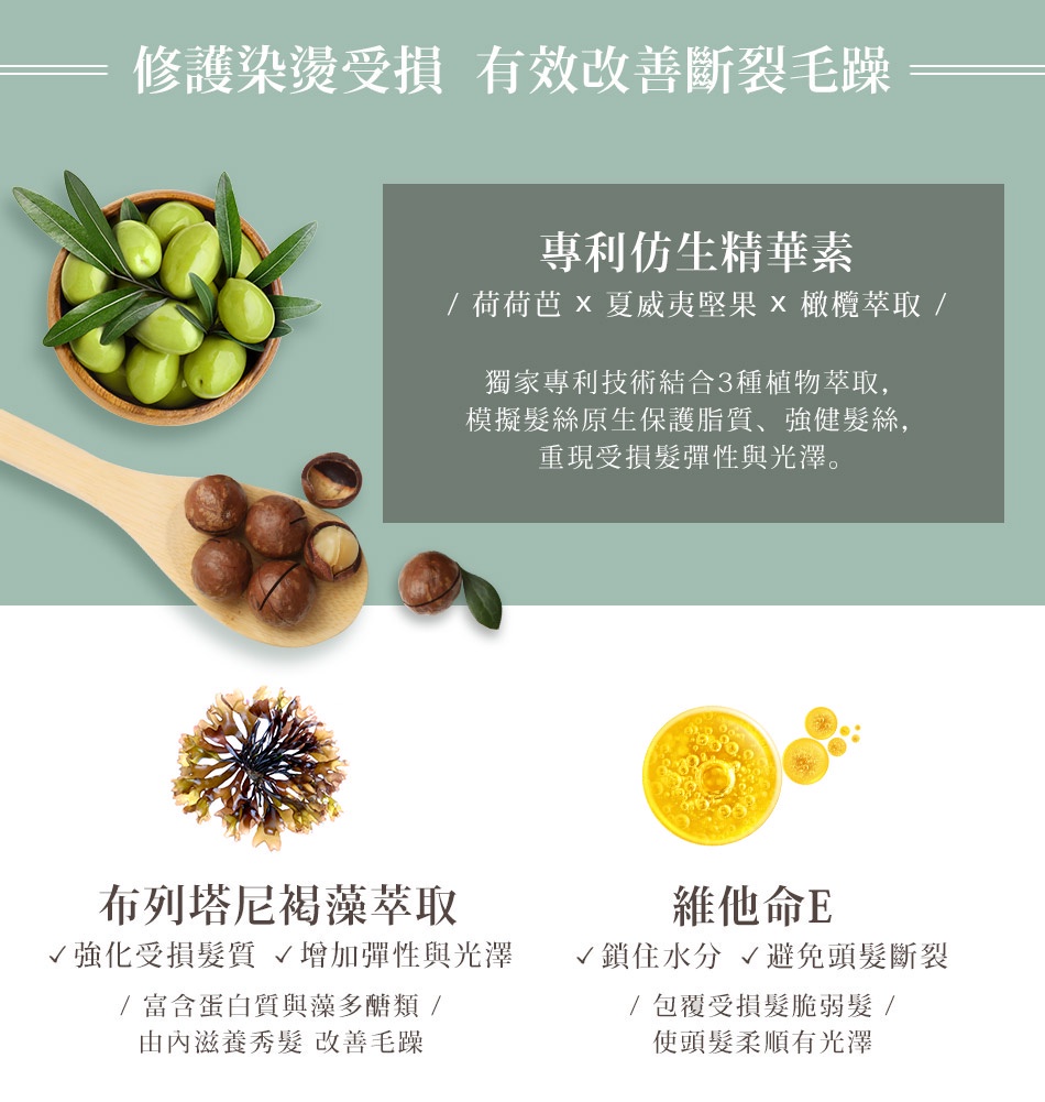 👍 專利仿生精華素:專利結合荷荷芭、夏威夷堅果、橄欖等植萃精華,模擬髮絲原生保護脂質,強健髮絲,重現受損髮彈性與光澤。