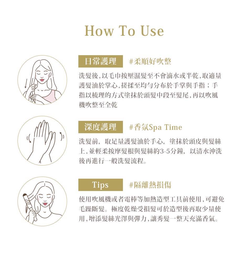※ 日常護理:洗髮後,先以毛巾按壓濕髮至不會滴水或半乾,取適量護髮油於掌心,搓揉至均勻分布於手掌與手指;再用手指以梳理的方式塗抹於頭髮中段至髮尾,再以吹風機吹整至全乾。