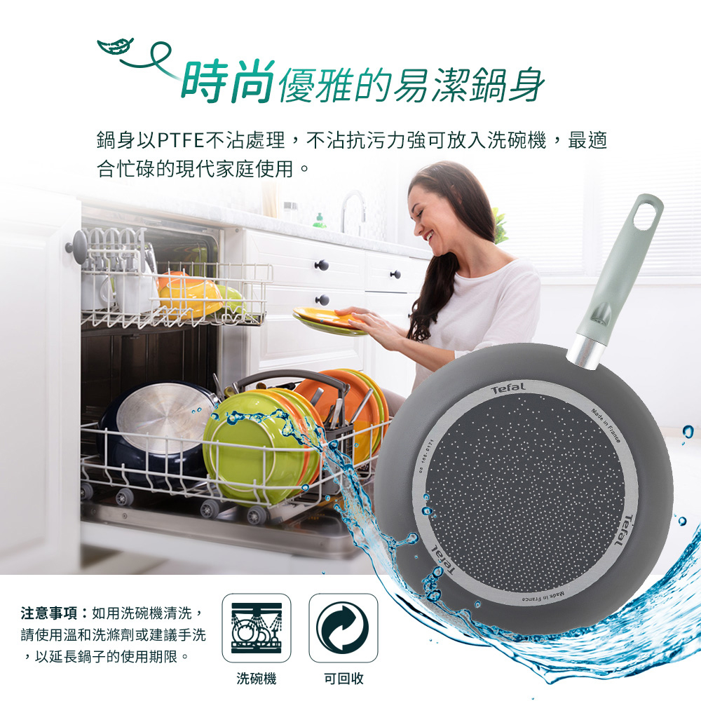 鍋身以PTFE不沾處理,不沾抗污力強,可放入洗碗機,最適合忙碌的現代家庭使用。