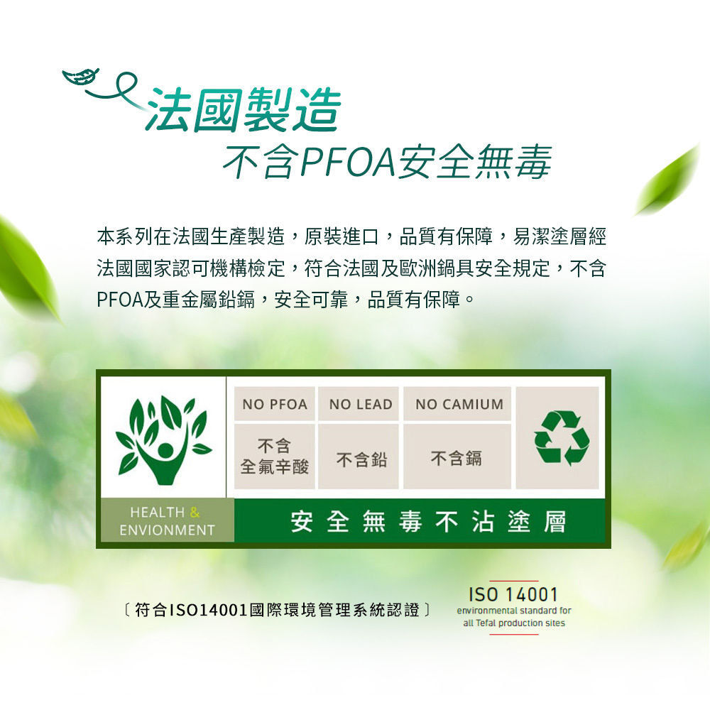 本系列在法國生產製造,原裝進口,易潔塗層經法國國家認可機構檢定,符合法國及歐洲鍋具安全規定,不含PFOA及重金屬鉛鎘,安全可靠,品質有保障。