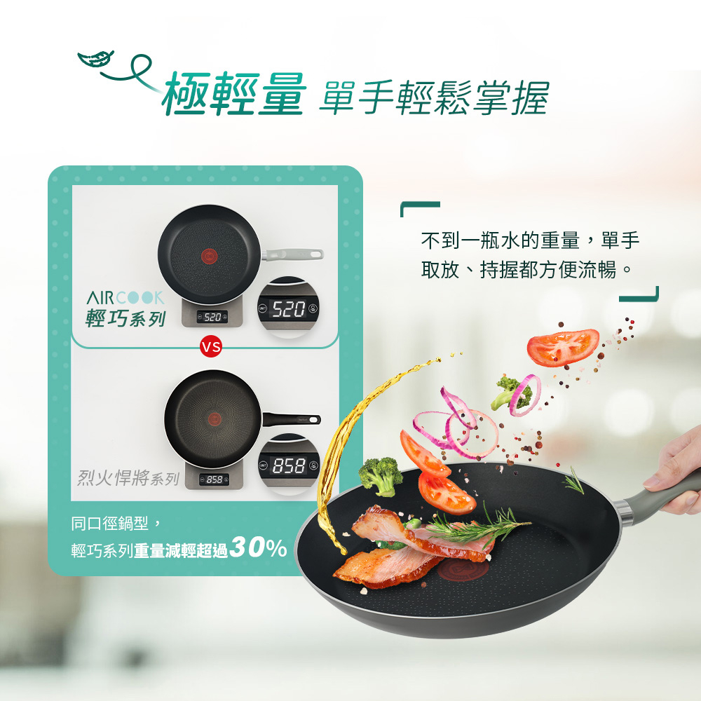 不到一瓶水的重量,單手取放、持握都方便流暢。同口徑鍋型,輕巧系列重量減輕超過30%。