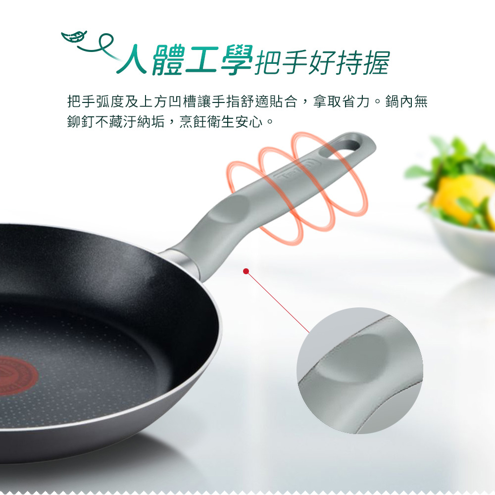 把手弧度及上方凹槽讓手指舒適貼合,拿取省力。鍋內無鉚釘不藏汙納垢,烹飪衛生安心。