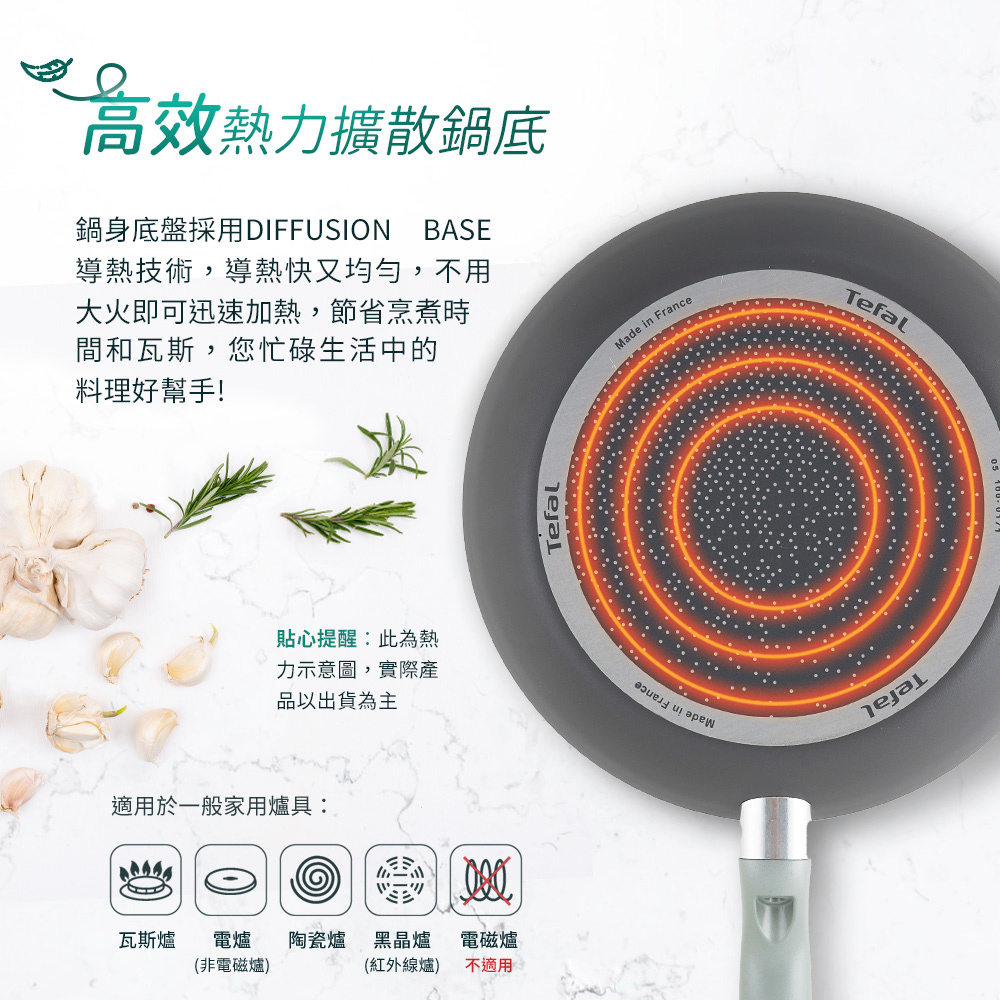 4.特福不沾鍋因鍋底設計具有高傳熱功能,建議用中小火烹調即可,節省能源又可避免營養流失,更能減少油煙的產生。