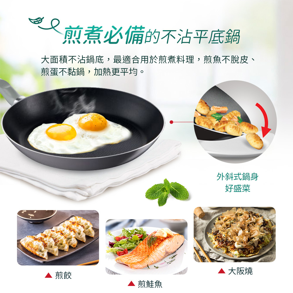 大面積不沾鍋底,最適合用於煎煮料理,煎魚不脫皮、煎蛋不黏鍋,加熱更平均。外斜式鍋身起鍋盛菜更順手。