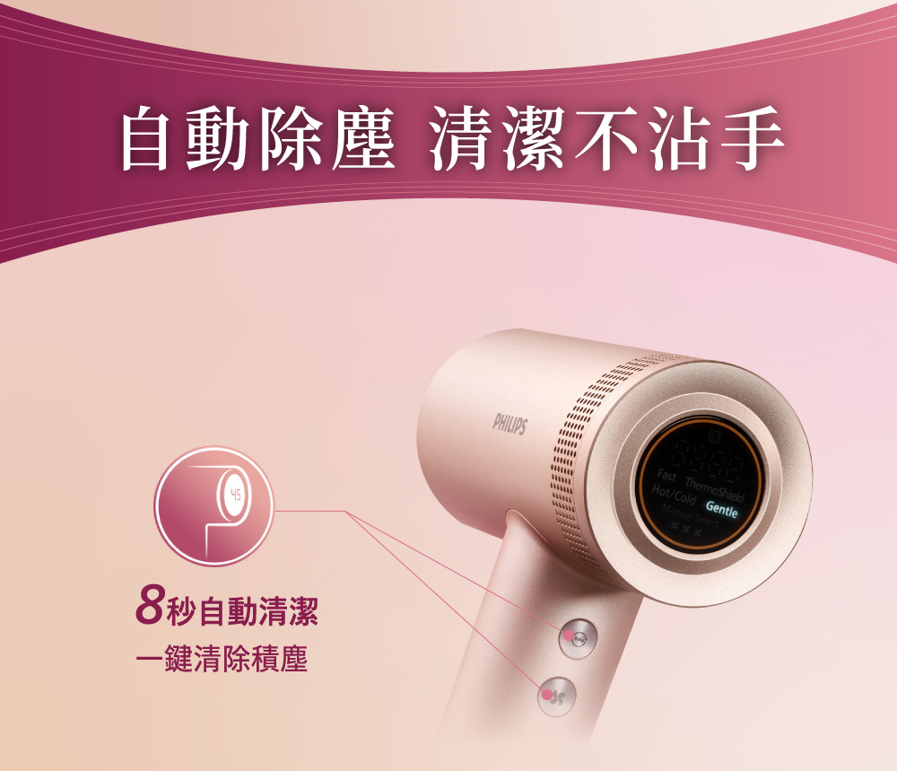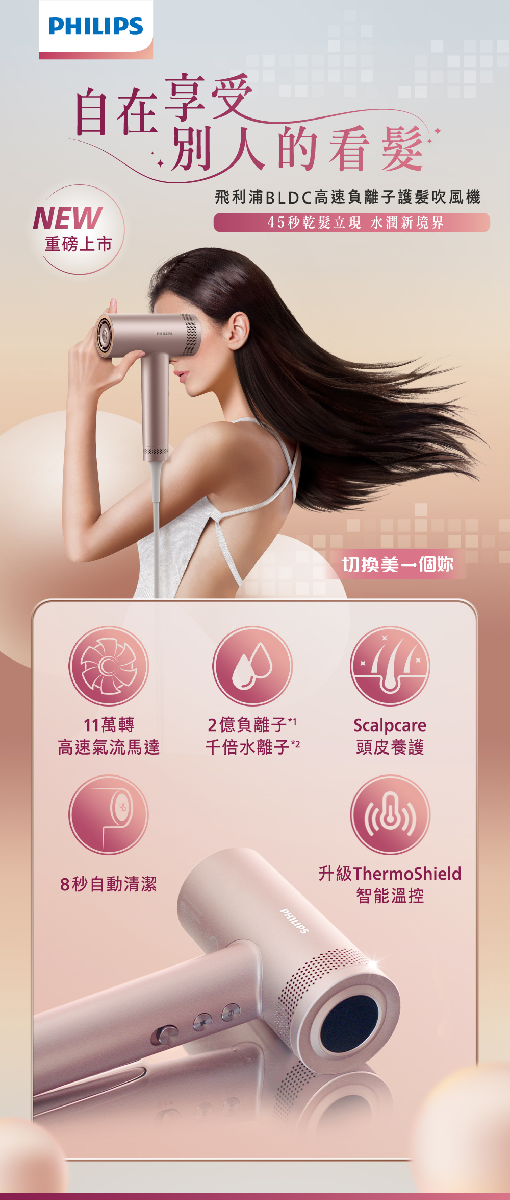 贈飛利浦溫控護色水潤直捲兩用負離子美髮造型器-迷霧紫BHS752 (數量有限送完為止) 11萬轉高速馬達:強風瞬乾 2億負離子+千倍水離子:極效鎖水 柔亮髮質 Scalpcare 頭皮養護:智能溫控技術,針對敏感頭皮溫柔呵護模式 LED 智能螢幕 8秒自動清潔模式 395g輕量美型