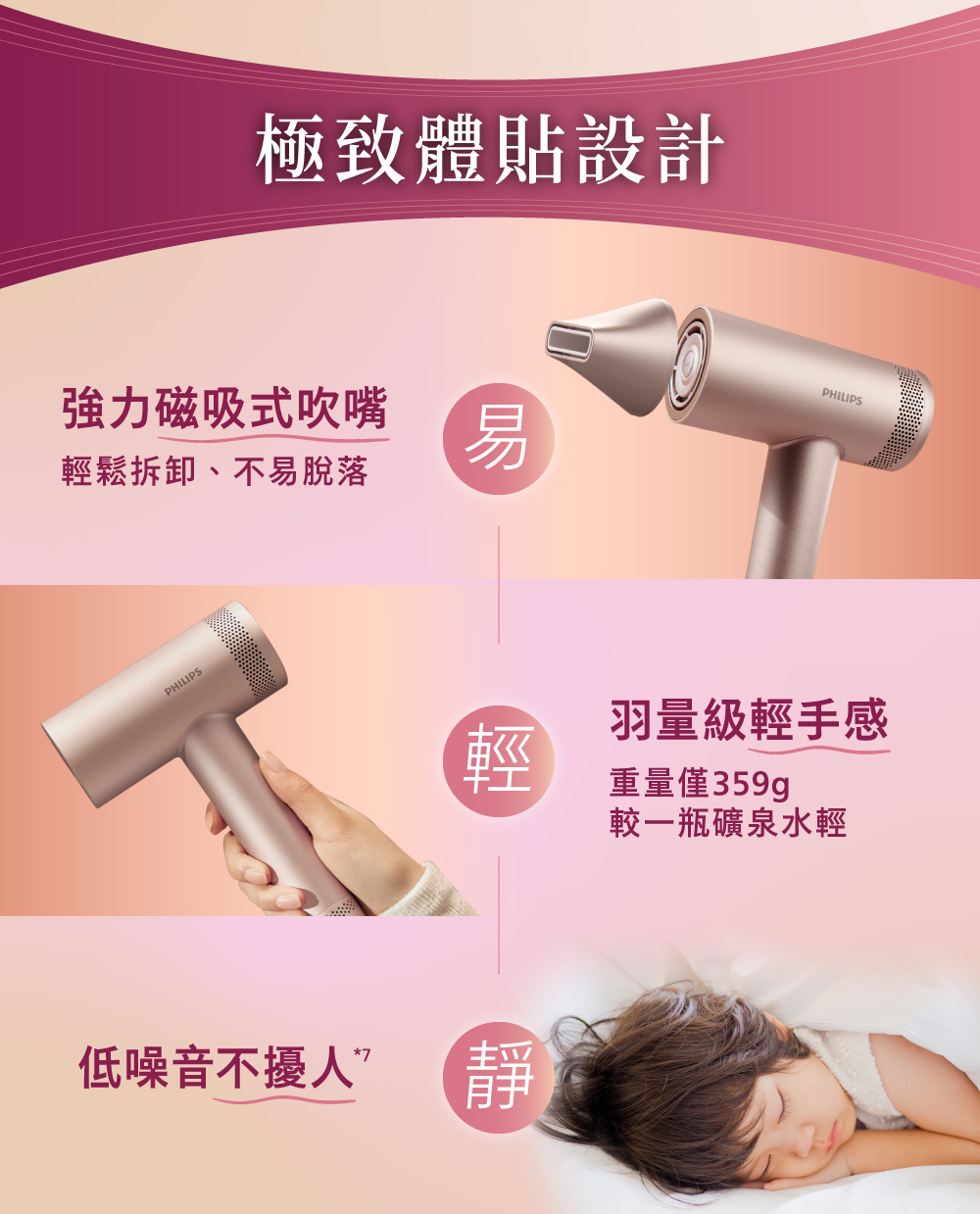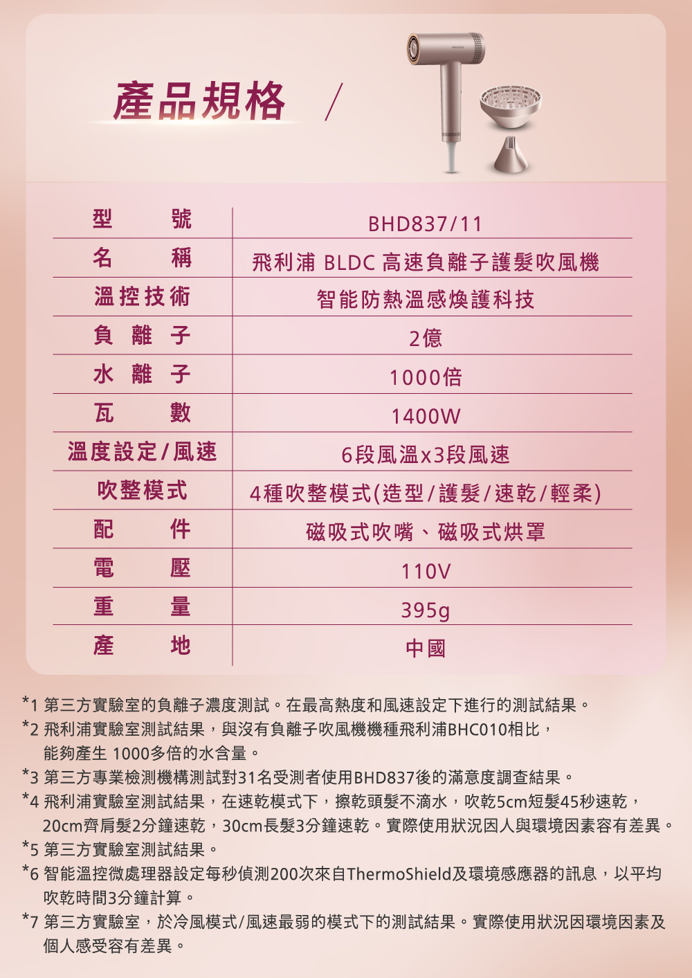 名稱:飛利浦 BLDC高速負離子護髮吹風機BHD837/41 溫控技術:智能防熱溫感煥護科技 負離子:2億 水離子:1000倍 瓦數:1400W 溫度設定/風速:6段風溫x3段風速 吹整模式:4種吹整模式(造型/護髮/速乾/輕柔) 配件:磁吸式吹嘴、磁吸式烘罩 電壓:110V 重量:395g 產地:中國