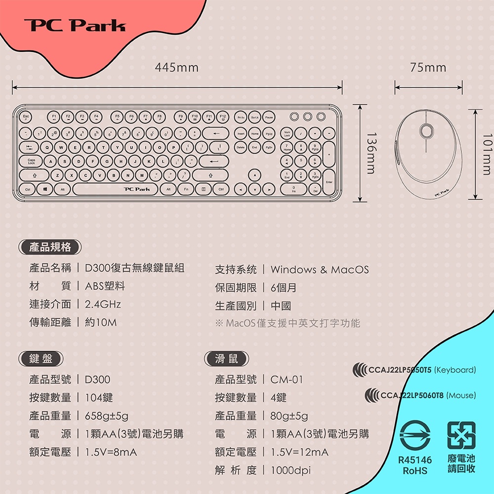 1.混彩配色鍵盤、滑鼠組 2.復古打字機設計 3.絕佳敲擊感的懸浮鍵帽 4.極佳省電技術,鍵盤、滑鼠各只需1顆AA(3號)電池 5.2.4G無線連接,10m遠距接收 原廠型號:D300藍