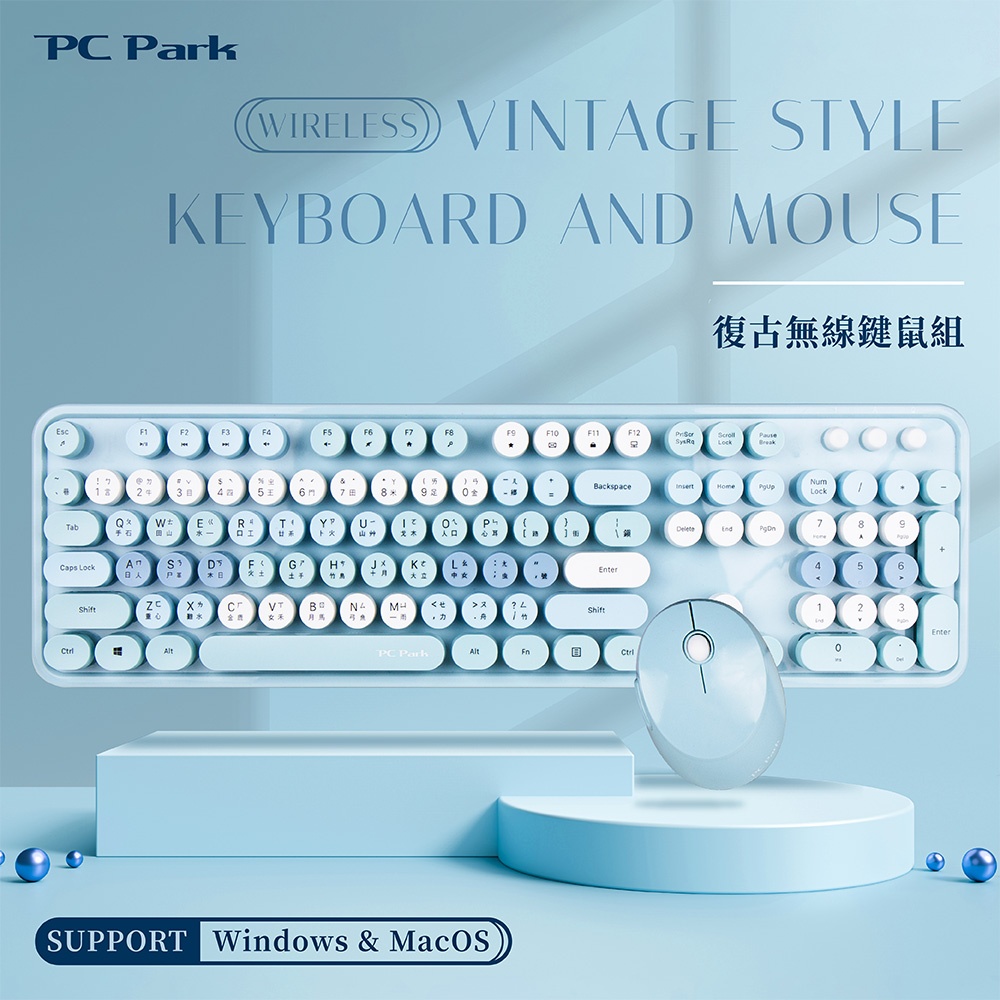 PC Park】D300復古無線鍵鼠組(藍)(2.4G無線+薄膜 復古打字機 鍵盤+滑鼠 絲印符號)