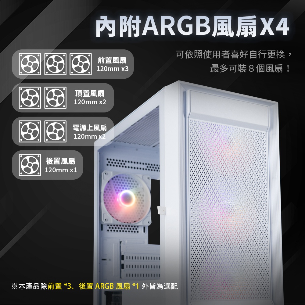 ‧內附RGB炫彩風扇x4 可由LED按鍵調整16種燈效模式