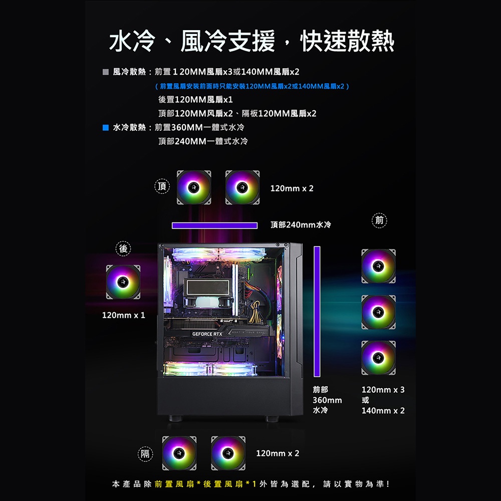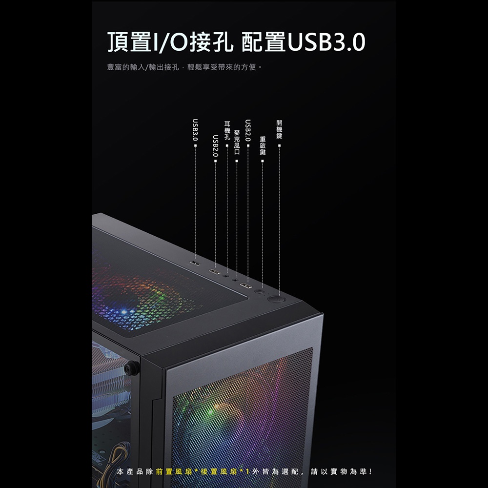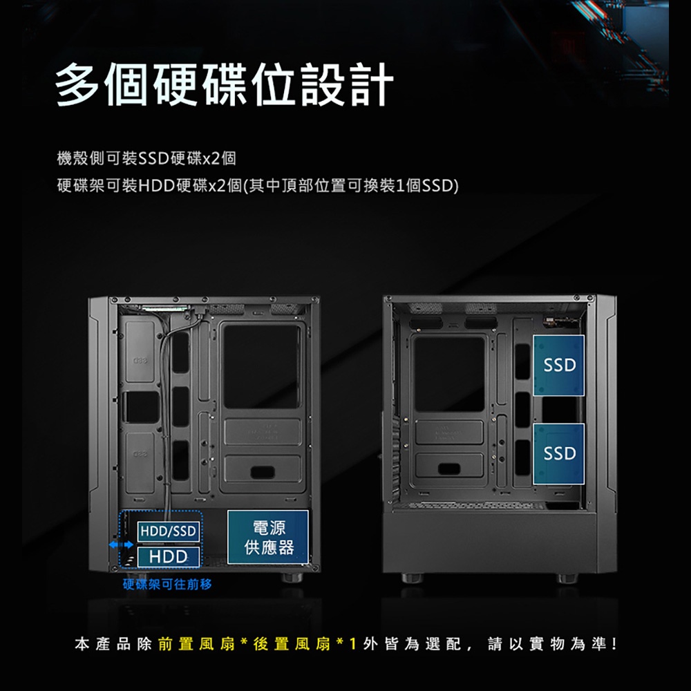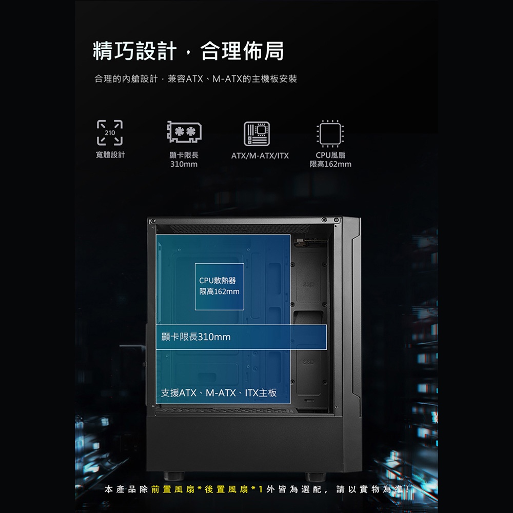 規格:2大2小 主機板規格:ATX / Micro-ATX / Mini-ITX 顏色:黑 體積:365x210x430mm 擴充空間:HDD*2/SSD*2 前置插槽:置USB3.0x1、USB2.0x2、HD AUDIOx1、MICx1 可裝風扇數:前12cm風扇x3(風扇14cmx2)/後12cmx1 頂12cmx2 電源遮罩12cmx2 內附風扇數:前2/後1 機殼材質:鍍鋅鋼板 側板開窗:有 風扇高度/顯卡長度:風扇120mm/140mm /顯卡310mm 保固(月):6個月