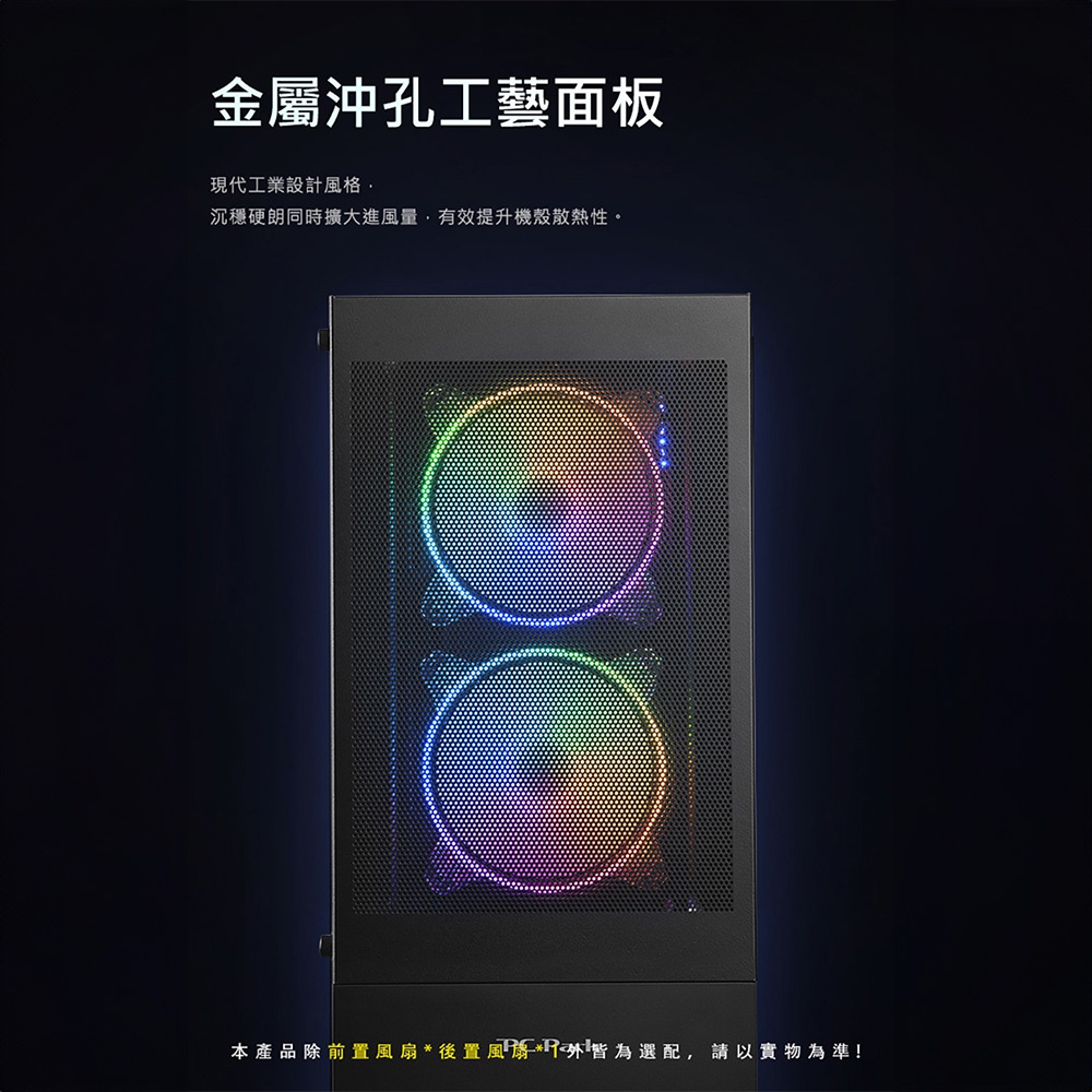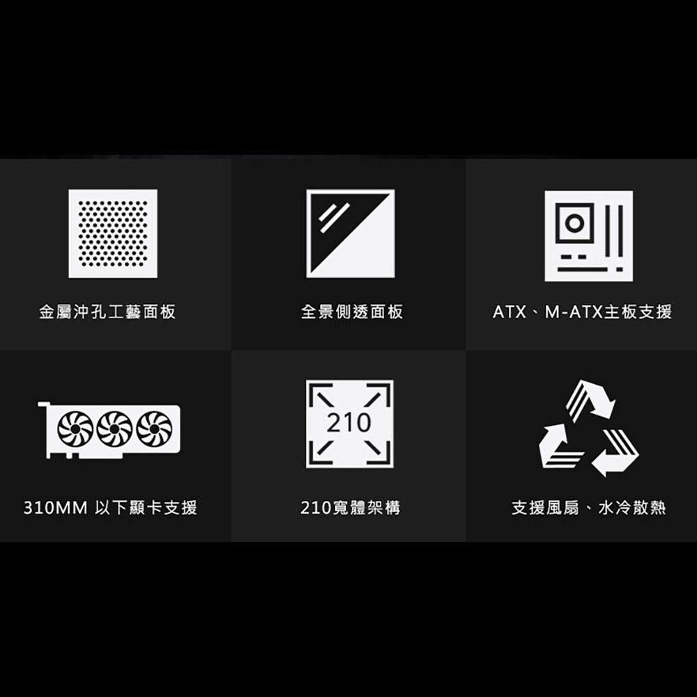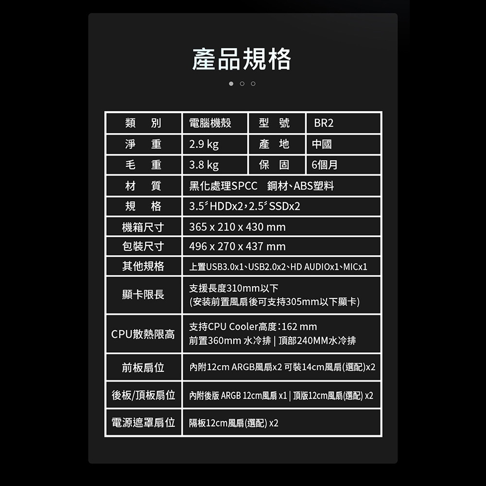 1.金屬沖孔工藝面板 2.全景壓克力側透 3.支援ATX、M-ATX主機板 4.絕佳的散熱構造 5.支援風/水冷散熱 6.微動開關設計 原廠型號:BR2