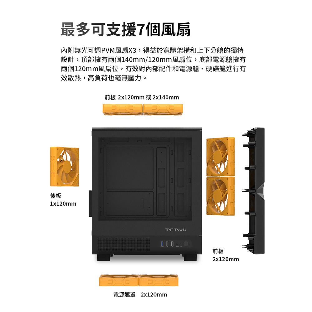 可裝風扇數:前板:12cm風扇 x2 後板:12cm 風扇 x1 頂板:12cm風扇 x2 or 14cm x2 電源遮罩:12cm風扇x2