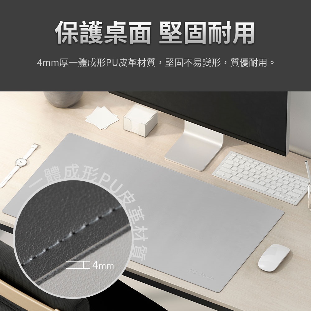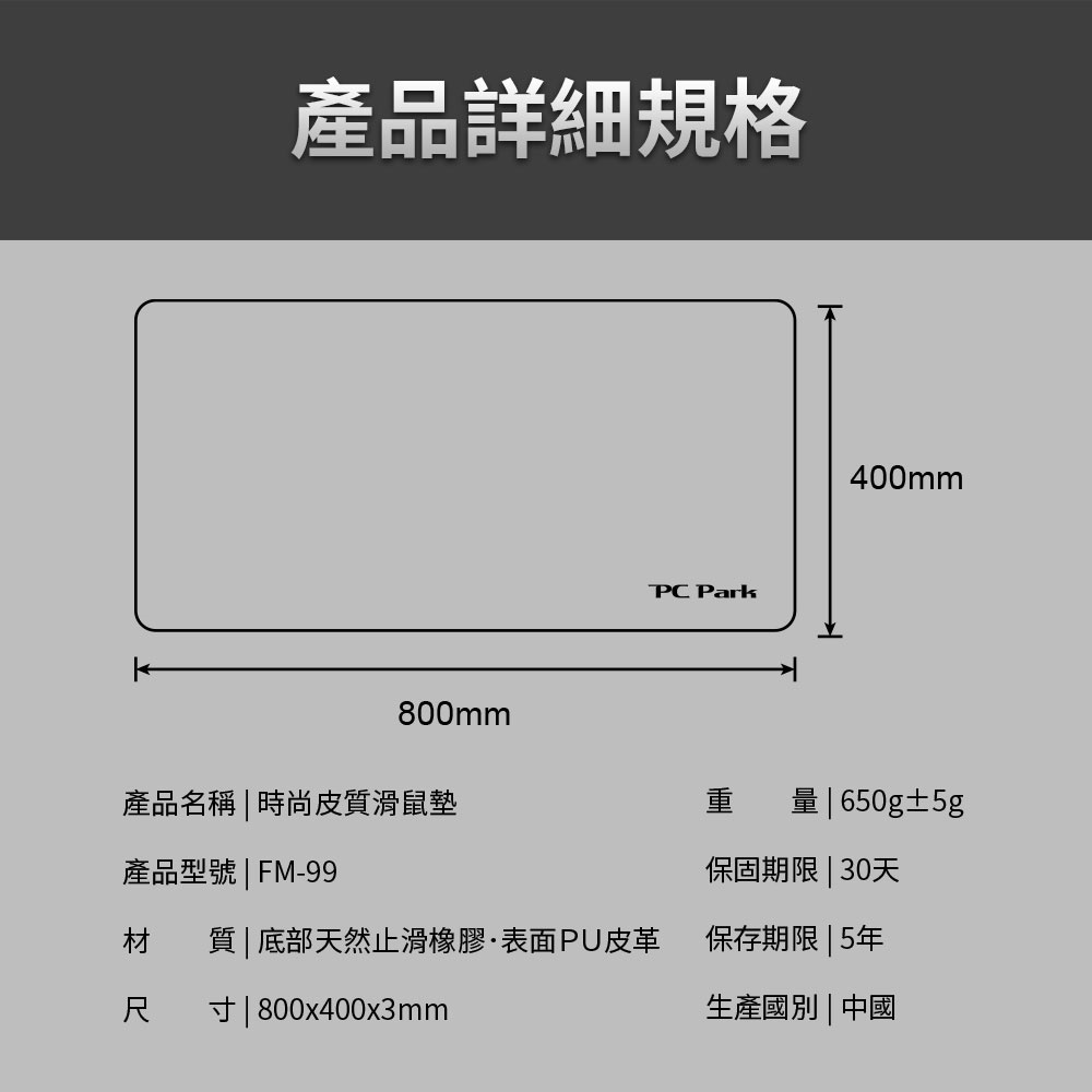 1.表面PU皮革-用紙巾擦拭,即可輕易的保持比面清潔,防水耐髒。 2.滑鼠適用面料-特選材質,降低表面阻力,使滑鼠移動更省力。 3.底部天然止滑橡膠-天然環保無毒橡膠材質,特殊紋理緊貼固定於桌面。 4.雙面精細縫線-邊角精細的車縫線保護,質優耐用。 5.大面積覆蓋-超大使用面積,搭配桌電筆電,打造您的時尚使用環境。 原廠型號:FM-99-B