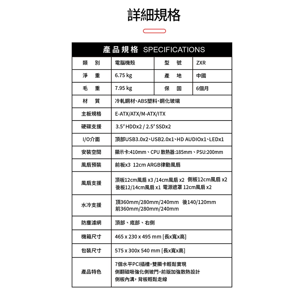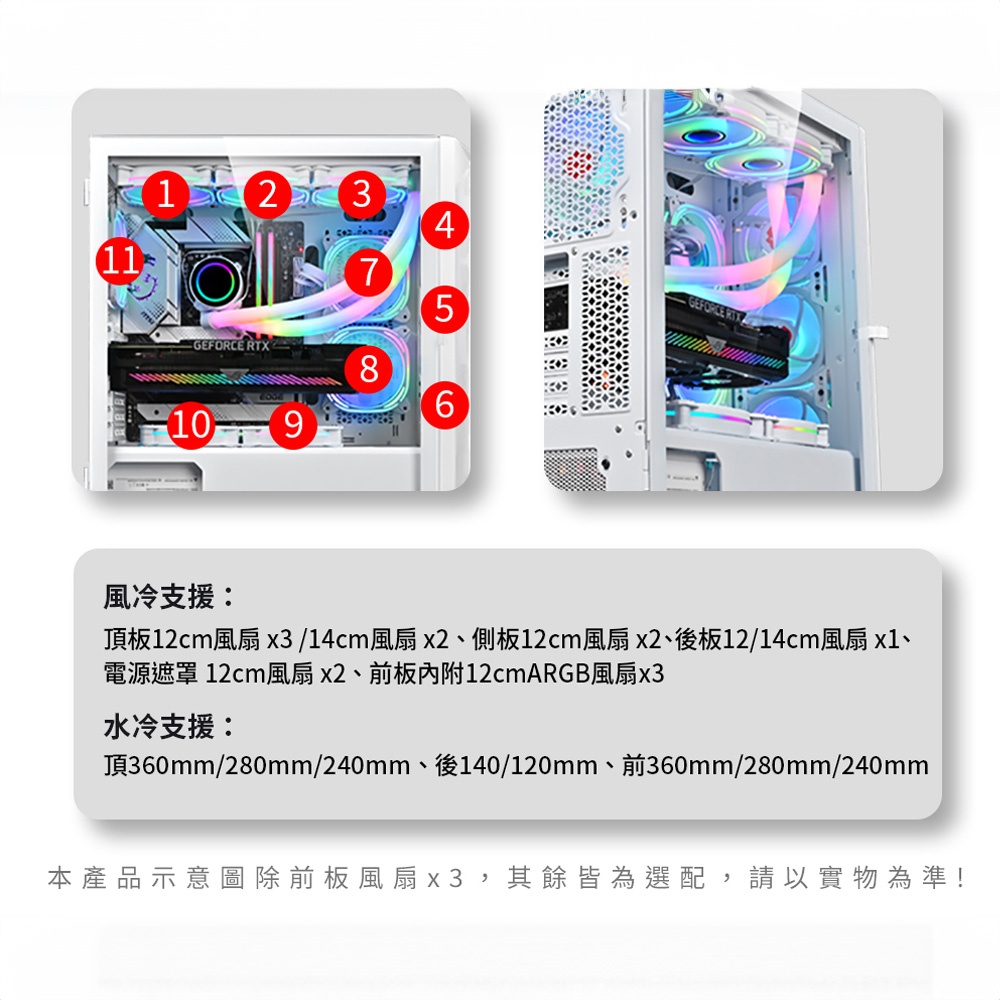 可裝風扇數:前板12CM風扇x3頂板12CM風扇x3 /14CM風扇x2 側板12CM風扇x2 後板12/14CM風扇x1 電源遮罩12CMx2