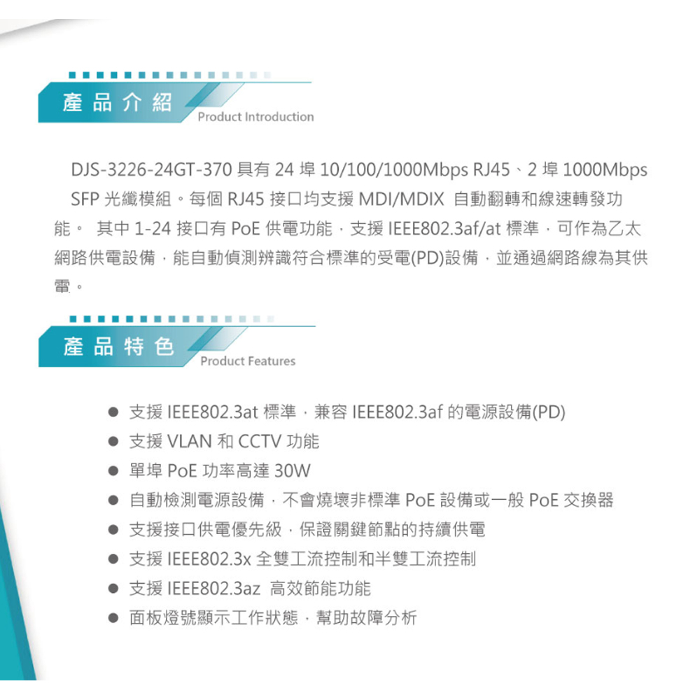 ◾ 自動檢測電源設備,不會燒壞非標準 PoE 設備或一般 PoE 交換器