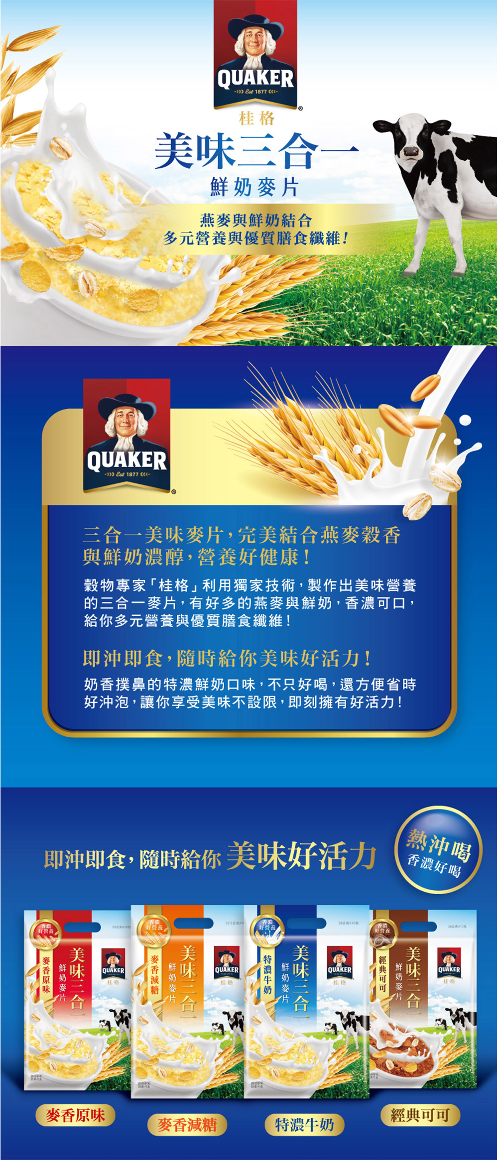 · 完美結合燕麥榖香與鮮奶濃醇,即沖即食,隨時給你美味好活力!