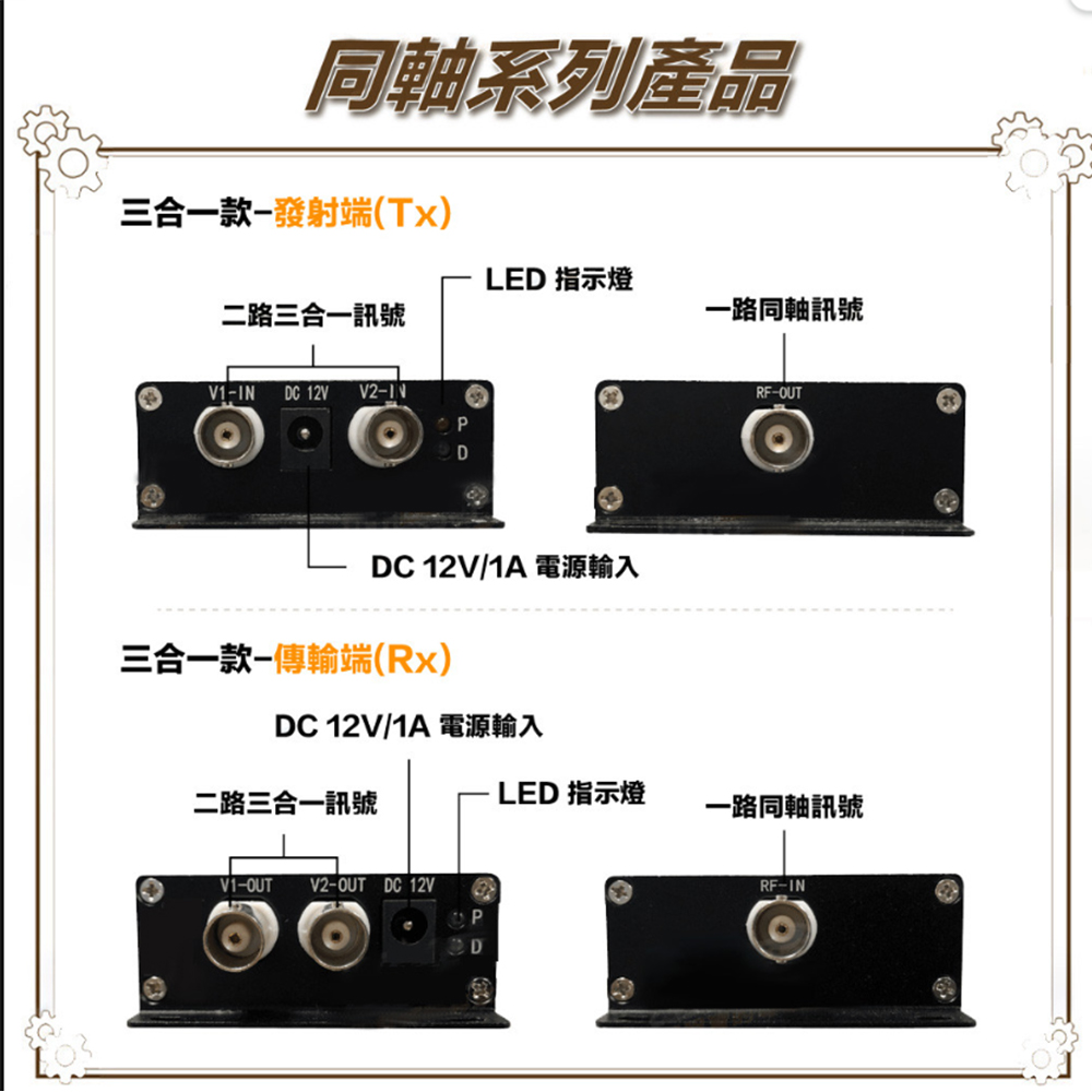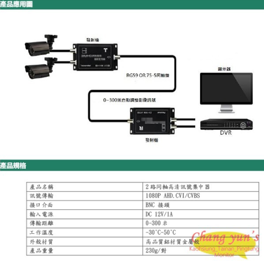 AHD/CVI 720P/1080P類比高清及傳統 類比訊號皆適用 2路影像訊號同時透過一條同軸線傳輸 採用先進及性能卓越的晶片技術,確保長時間可穩定工作 施工簡單、安裝方便、即插即用、免調整