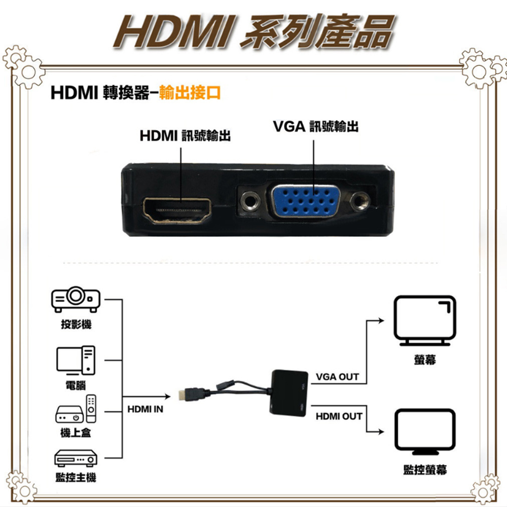可將 HDMI 輸入轉 HDMI & VGA+Audio 輸出。 HDMI 輸入:720P / 1080P@60Hz。 支持 HDCP 協議,支持 HDMI 1.3 版。 HDMI 與 VGA+Audio 同步輸出。 音頻輸入:3.5 mm 音頻口。 即插即用,無需任何軟體驅動。 HDMI 與 VGA 同步輸出。