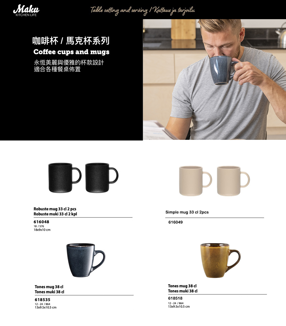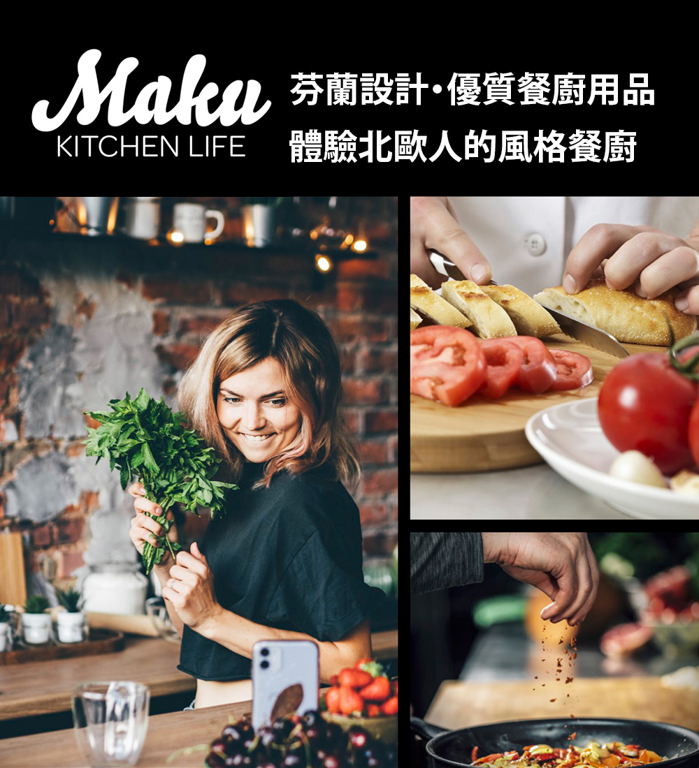芬蘭品牌 Maku Kitchen Life,專為熱愛烹飪、懂得享受生活美好時刻的人而設計。全系列產品涵蓋烹飪、烘焙、餐桌用品及廚房收納,從新手到料理愛好者,每個人都能輕鬆上手,享受下廚的樂趣與舒適的廚房氛圍。Maku Kitchen Life 不僅重視實用性,更在經典設計中注入時尚新意,簡約而不單調的風格,讓日常廚房用品也能成為生活中的美感元素。品質、易用性與設計美觀,始終是貫穿全系列的核心精神。