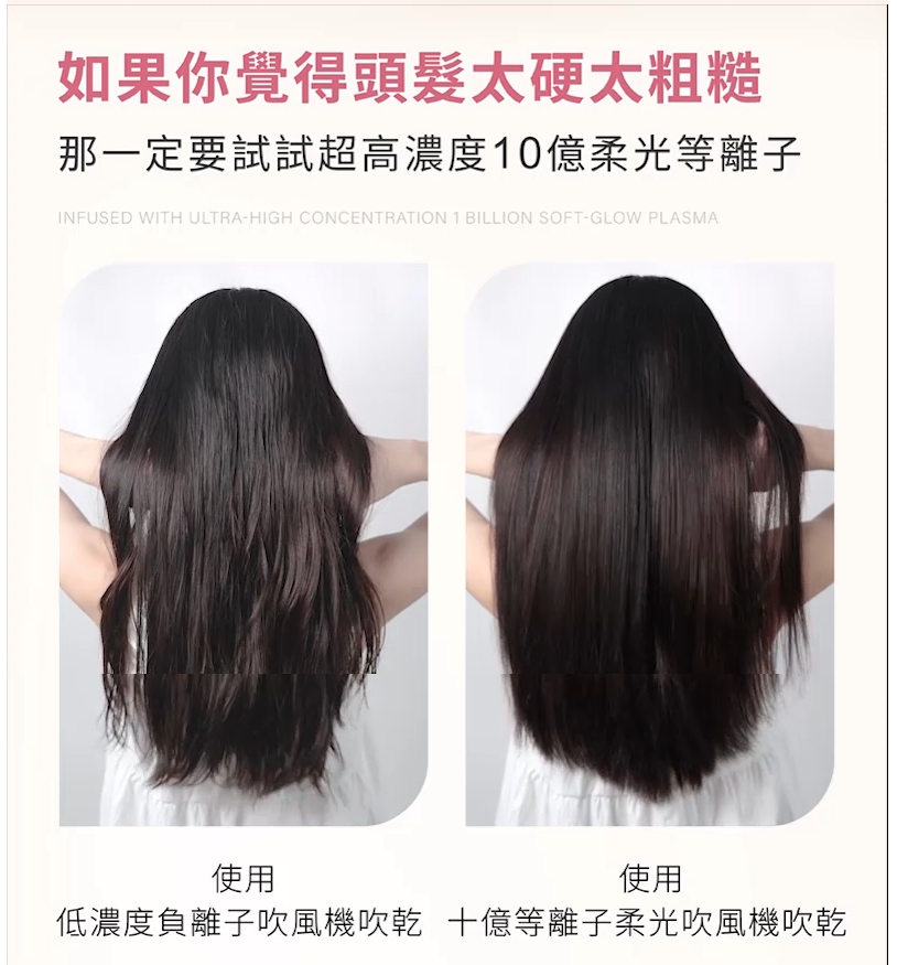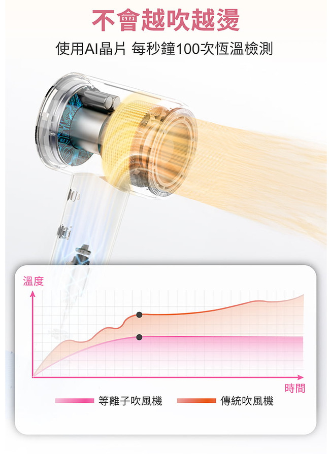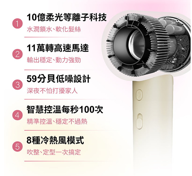 十億等離子科技:有效抗靜電、減少毛躁,吹後髮絲柔順亮澤 高速無刷馬達:11 萬轉強勁風力,快速吹乾不拉扯髮絲 智慧控溫系統:每秒 100 次溫度監測,穩定不過熱,呵護髮質 靜音設計:59dB 低噪音運轉,深夜使用也安心 多段風溫模式:8 種冷熱風設定,滿足護髮與造型需求