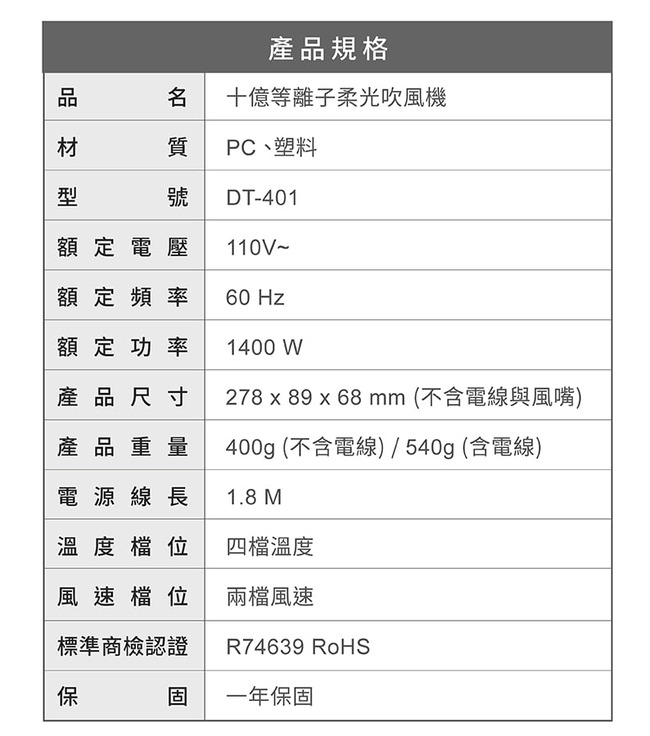 技術規格表:十億等離子柔光吹風機 型號(官方商品型號):DT-401 保固期:原廠保固一年 維修保固資訊:原廠保固一年 配件: 原產地(國):中國 貨源:原廠公司貨 能源標章:無 BSMI:R32573 NCC: