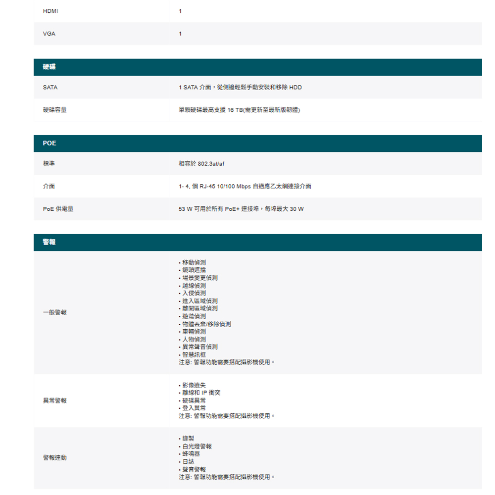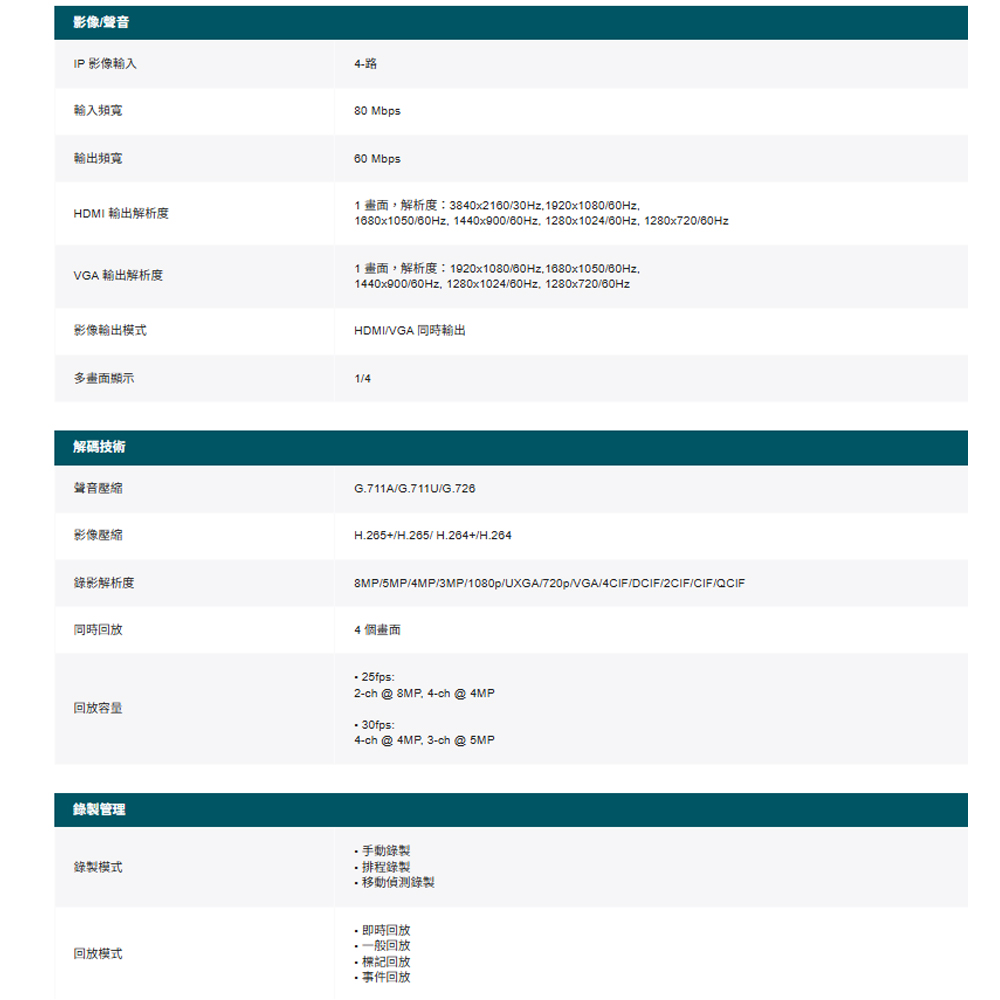 4K HDMI 影像輸出及16MP 解碼能力:提供高達 8MP 的更清晰影像解析度以及 4 路畫面顯示,確保您可以從任何角度捕捉所有細節。