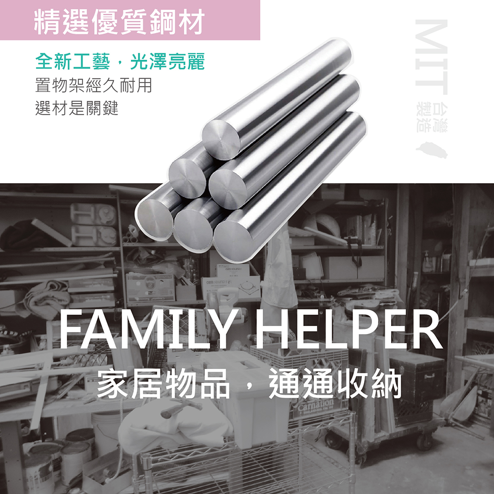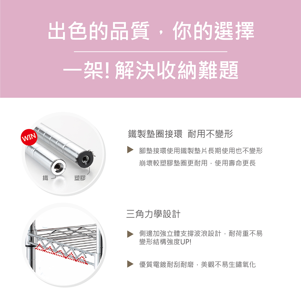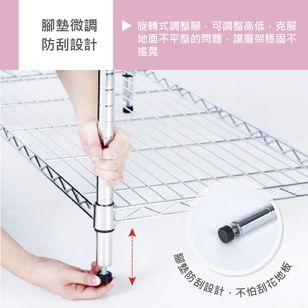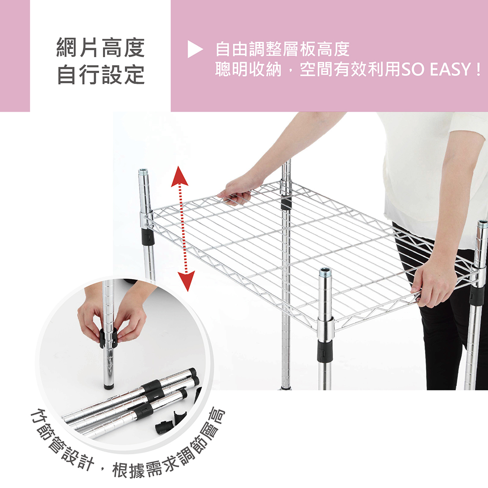 【層架特色】 ● 層架自由調高度,讓收納空間加倍! ● 可加購輪子加裝,方便好推變身置物推車。 ● 本產品台灣製造,品質保證、堅固耐用。 ● 經優質處理,無毒、不過敏、耐刮、耐磨、耐氧化而不易生鏽。 ● 每片網片平均荷重50kg。 ● 網片採夾片式固定,耐用且安裝簡單。 ● 採用中鋼同等級鋼材製造,獨家加粗鐵線及加密網片,更加耐重耐用。 ● 網片採鐵線製成,荷重能力優於木板,使用上更安心持久。 ● 鐵網網片為立體三腳力學設計,側邊加強立體支撐波浪設計,耐荷重,不易變形,結構強度UP! ● 閃電紋插銷式上管,即插即用,快速簡單。 ● 腳墊的防刮設計,不怕刮花地板。 ● 附有旋轉式調整腳可調整高低,克服地面不平整的問題,讓層架穩固不搖晃。 ● 採DIY免工具、輕鬆裝,可依需求自行搭配組裝。