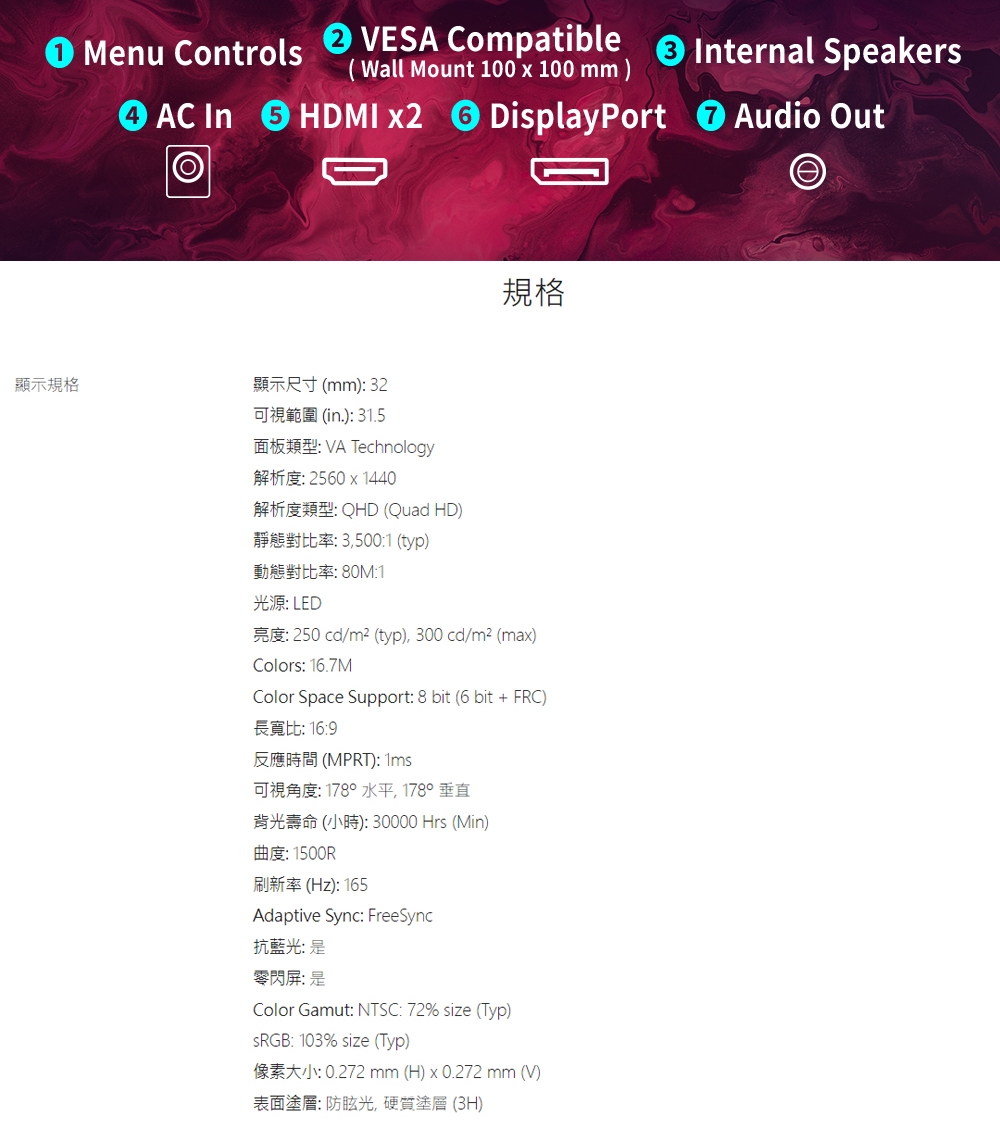 類型:VA (Curved 1500R)