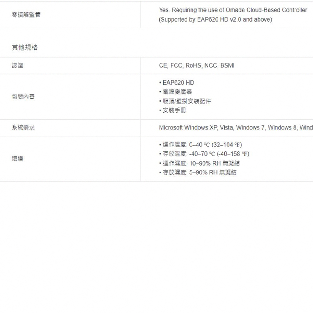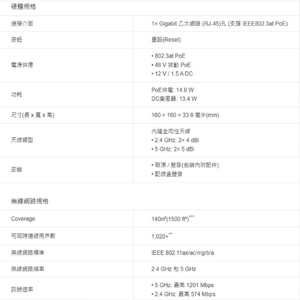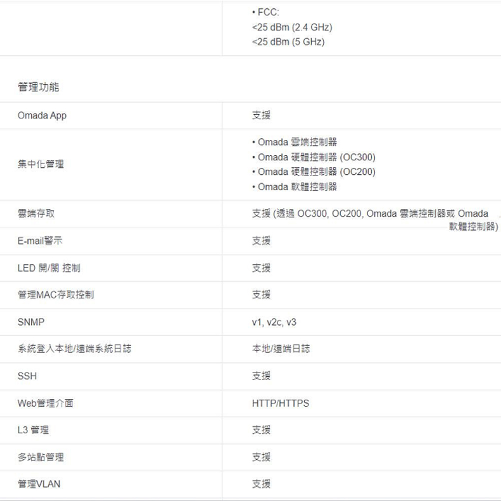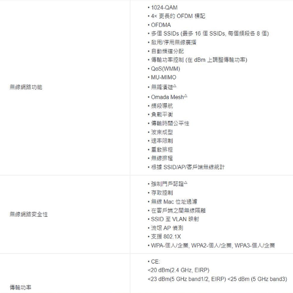 超高速 Wi-Fi 6: 同時提供 574 Mbps(2.4 GHz)和 1201 Mbps (5 GHz) 共 1775 Mbps Wi-Fi 速度。 高密度連線: 4× 增加的容量可同時連接更多設備。 整合至 Omada SDN: 零接觸部署 (ZTP) ,集中雲端管理和智慧監控。 集中化管理: 雲端存取和 Omada app 提供超便利和簡易管理。 無縫漫遊: 就算用戶四處走動也不影響影片串流和語音通話的品質。 支援 PoE+: 支援乙太網供電 (802.3at) 提供更便利的部署和安裝。 安全的訪客網路: 包含多種驗證選項 (SMS/Facebook Wi-Fi/ 驗證碼...) 以及大量無線安全性技術。 BSMI:R38330 NCC: CCAR21LP0920T1